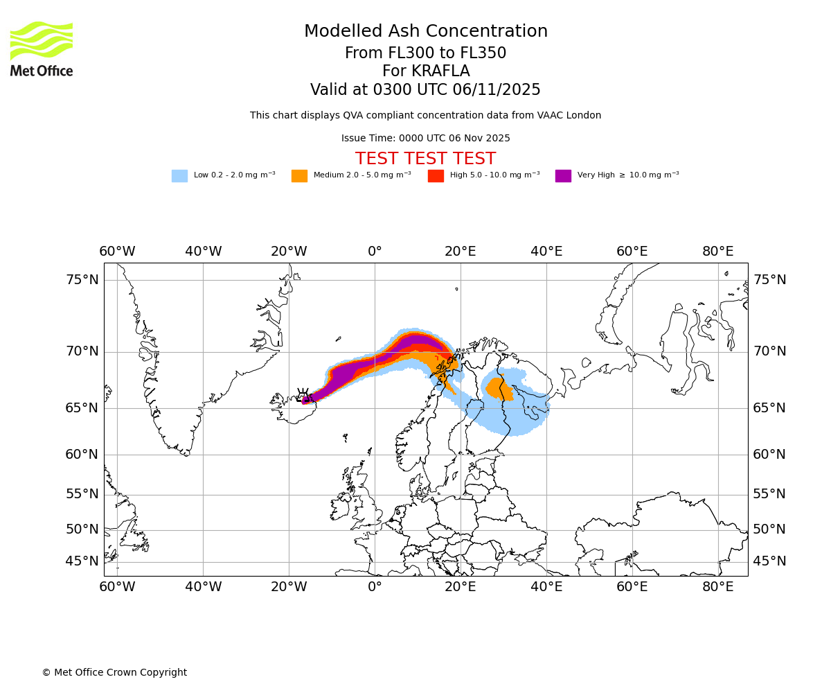 Modelled ash concentration from 300 to 350 for KRAFLA. Valid at 0000 UTC 06/11/2025