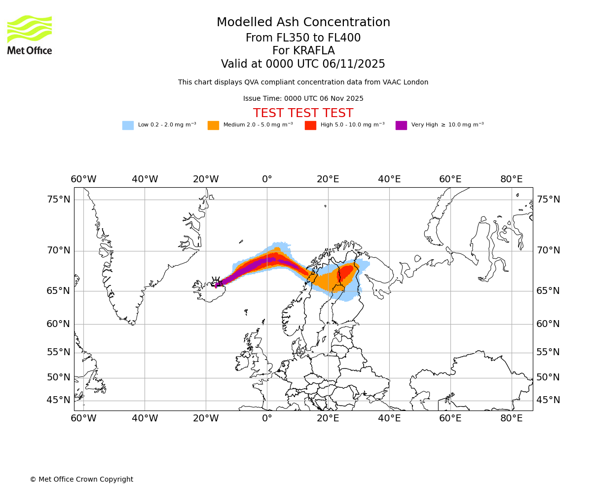 In accordance with ICAO Annex 3, Amendment 82 VAAC London will provide operational QVA forecasts from 27 November 2025 and these will be made available via a VAAC London QVA API information service. These charts are currently provided for test and evaluation purposes (not for operational use) until the introduction of the operational service.