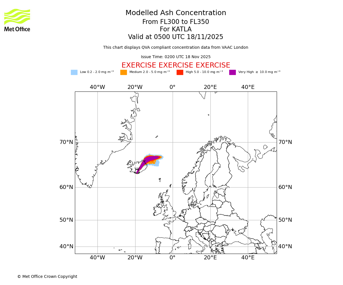 Modelled ash concentration from 300 to 350 for KATLA. Valid at 0200 UTC 18/11/2025