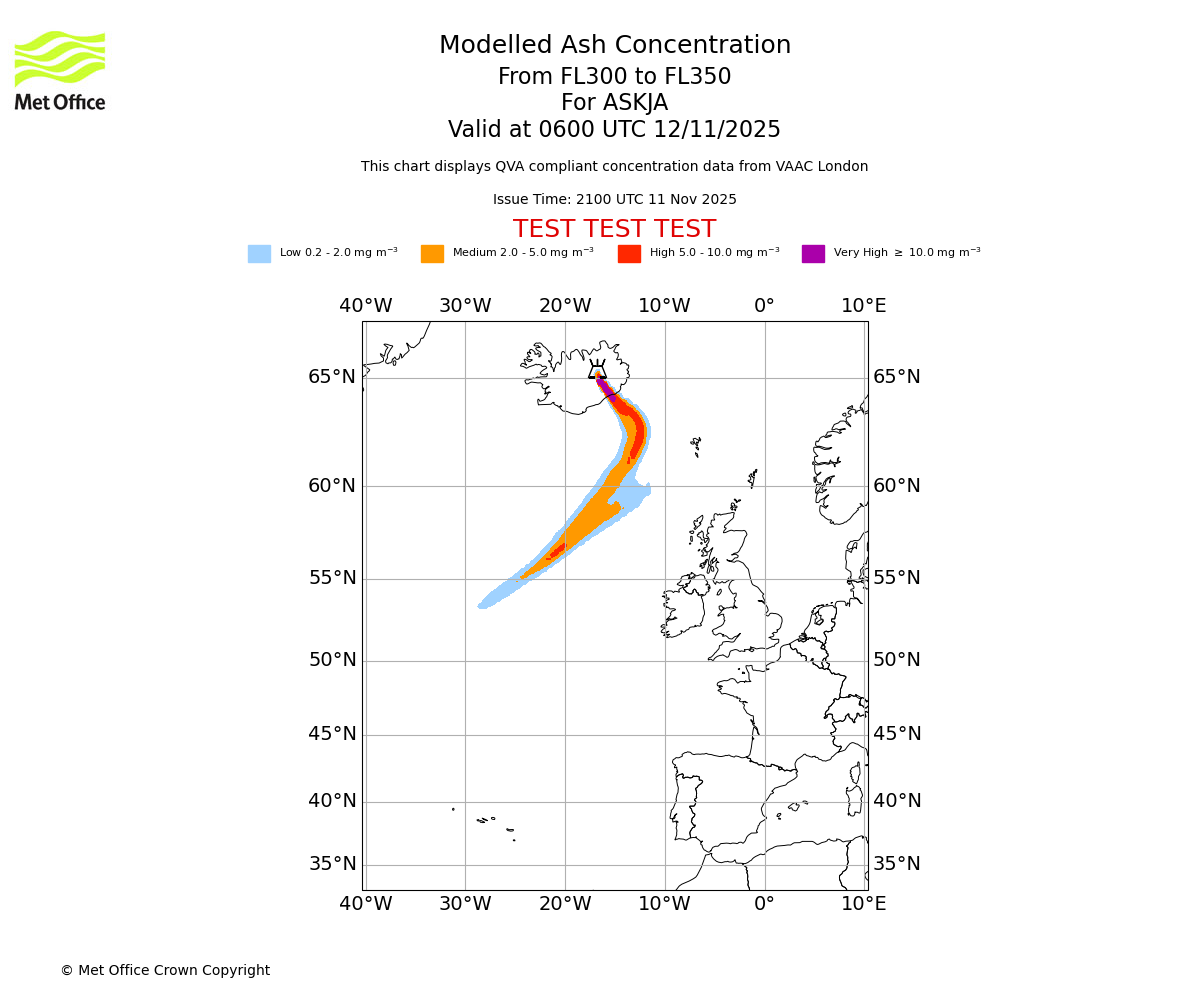 In accordance with ICAO Annex 3, Amendment 82 VAAC London will provide operational QVA forecasts from 27 November 2025 and these will be made available via a VAAC London QVA API information service. These charts are currently provided for test and evaluation purposes (not for operational use) until the introduction of the operational service.