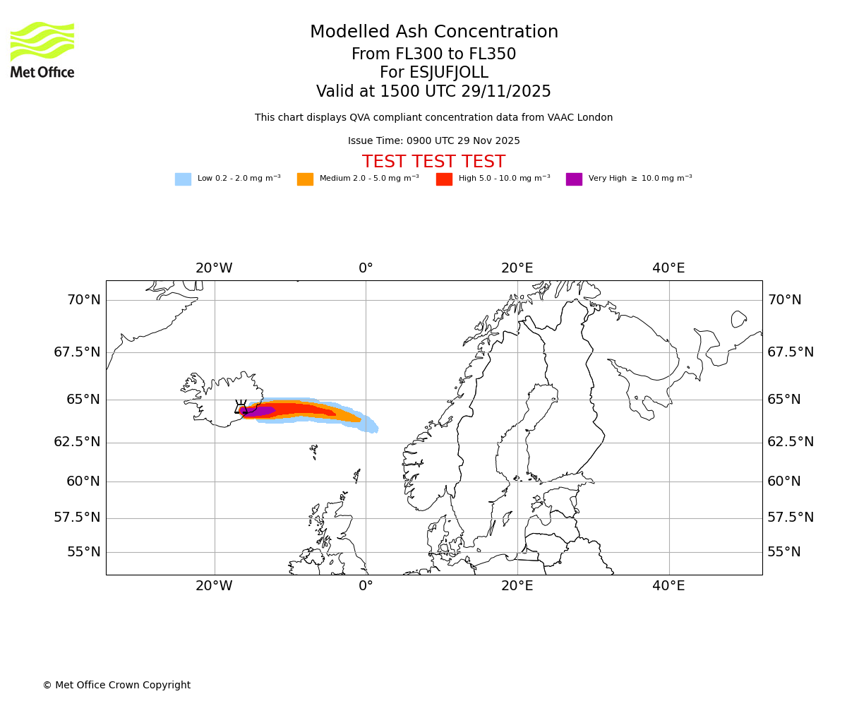 Modelled ash concentration from 300 to 350 for ESJUFJOLL. Valid at 1200 UTC 29/11/2025