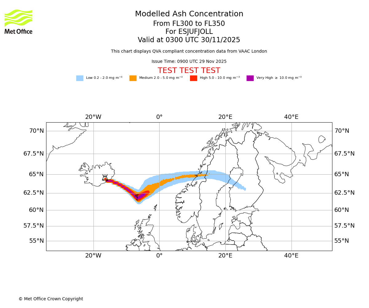 Modelled ash concentration from 300 to 350 for ESJUFJOLL. Valid at 0000 UTC 30/11/2025