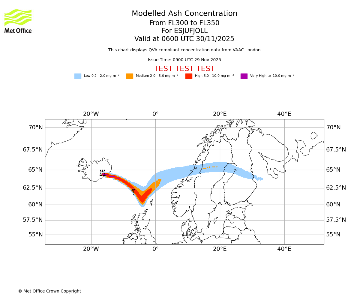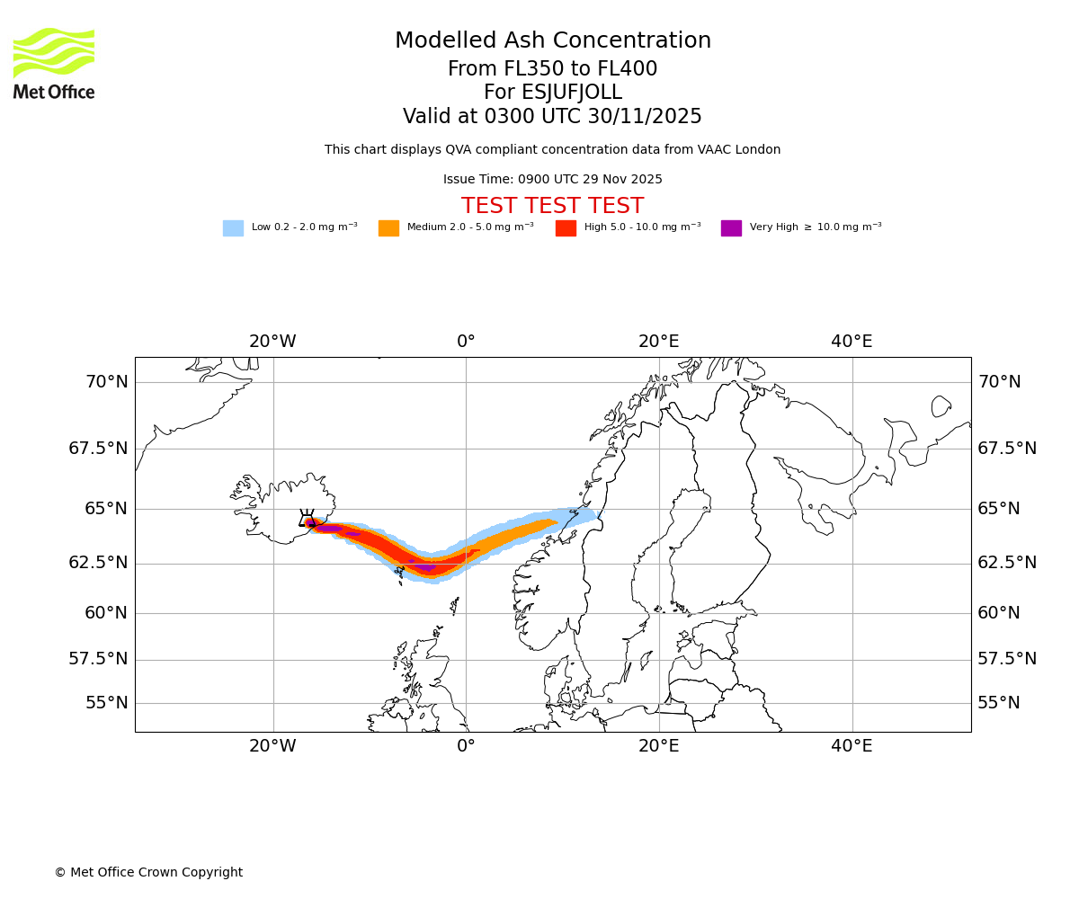 Modelled ash concentration from 300 to 350 for ESJUFJOLL. Valid at 0300 UTC 30/11/2025