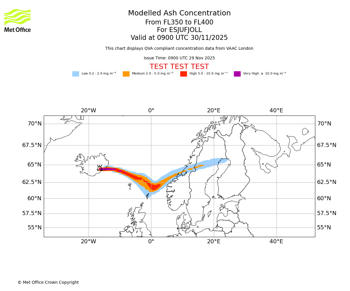 Modelled ash concentration from 300 to 350 for ESJUFJOLL. Valid at 0900 UTC 30/11/2025