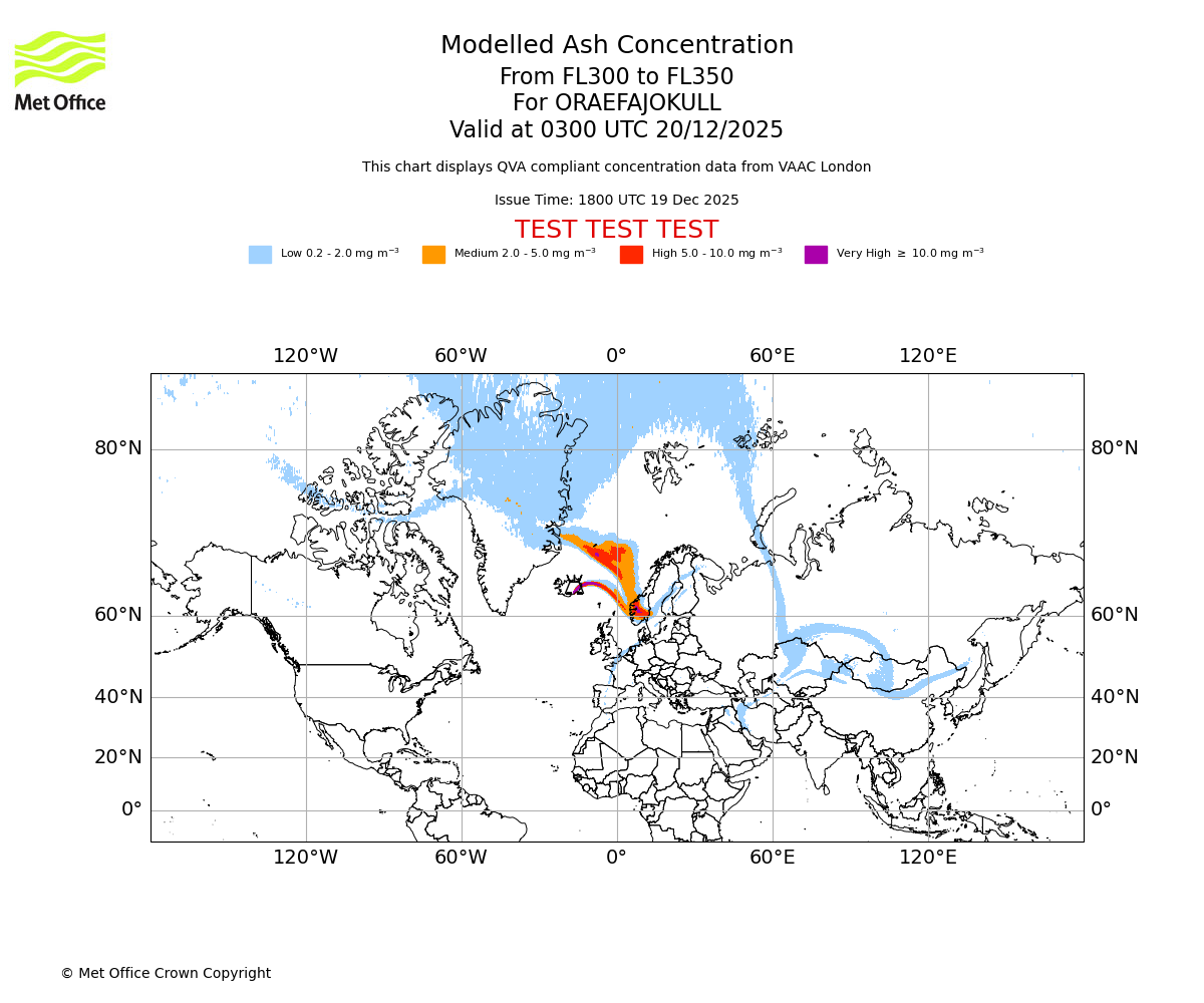 Modelled ash concentration from 300 to 350 for ORAEFAJOKULL. Valid at 0000 UTC 20/12/2025