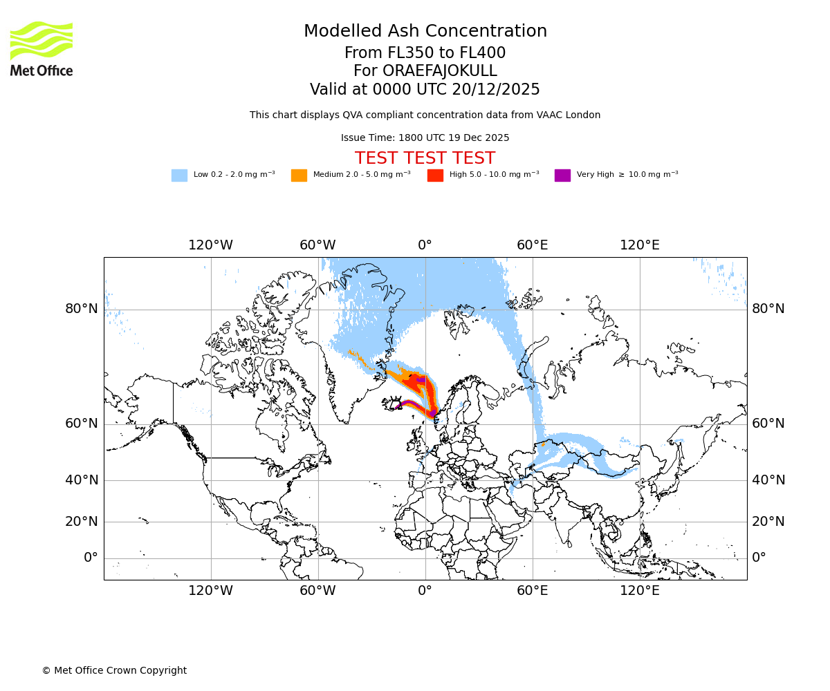 Modelled ash concentration from 000 to 200 for ORAEFAJOKULL. Valid at 1800 UTC 19/12/2025
