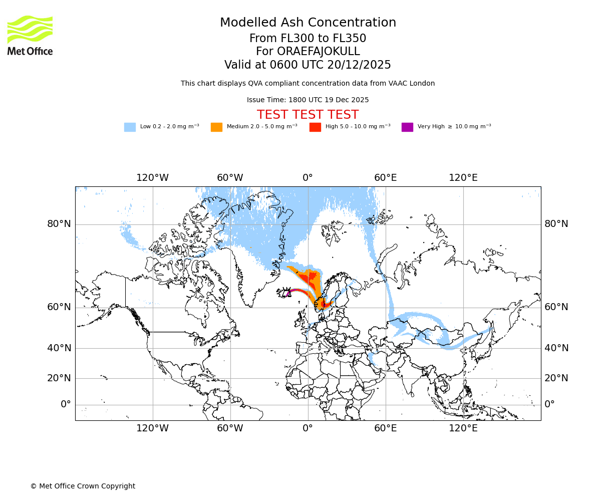 Modelled ash concentration from 300 to 350 for ORAEFAJOKULL. Valid at 0300 UTC 20/12/2025