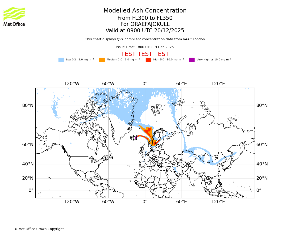 Modelled ash concentration from 300 to 350 for ORAEFAJOKULL. Valid at 0600 UTC 20/12/2025
