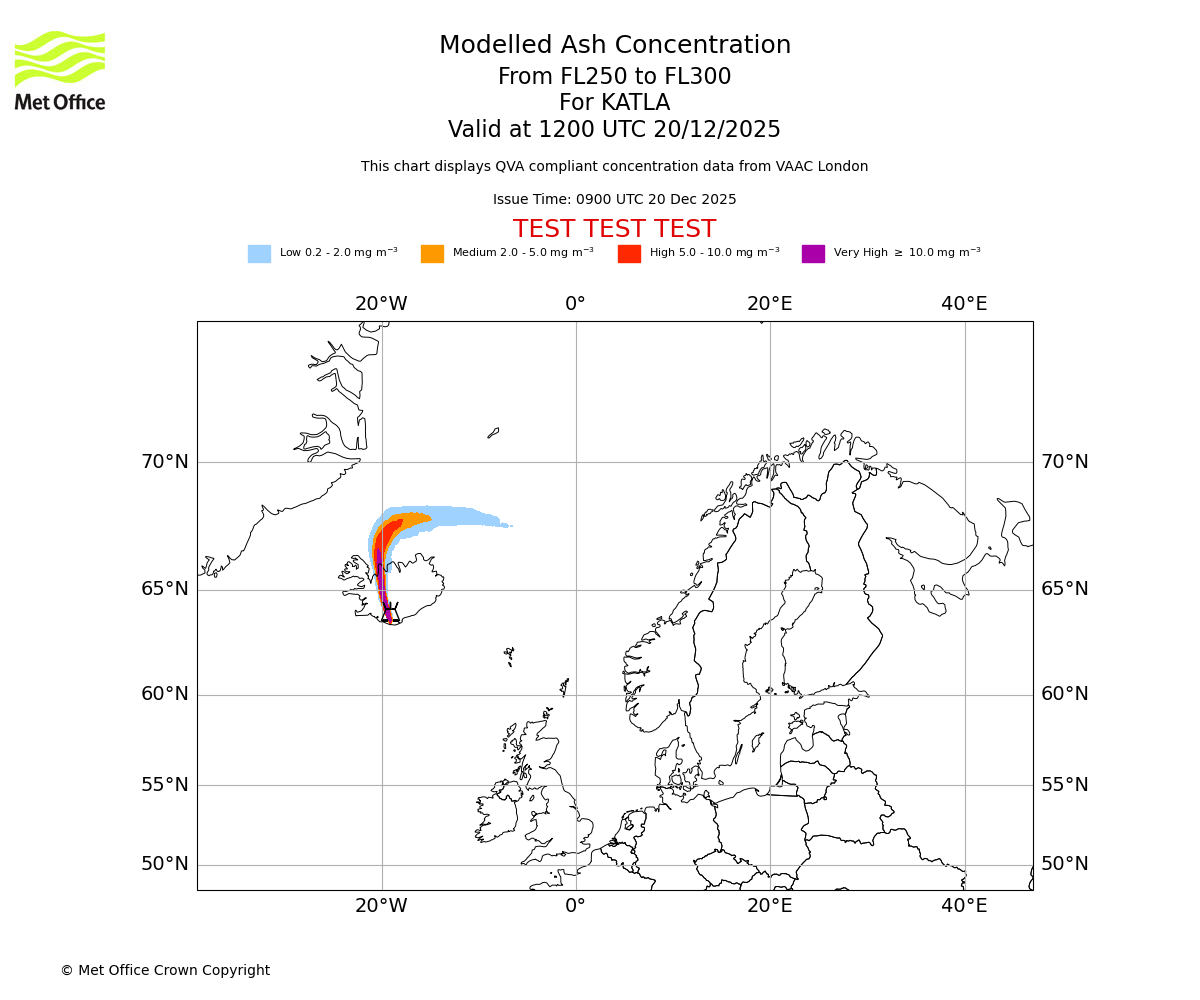 Modelled ash concentration from 000 to 200 for KATLA. Valid at 0900 UTC 20/12/2025