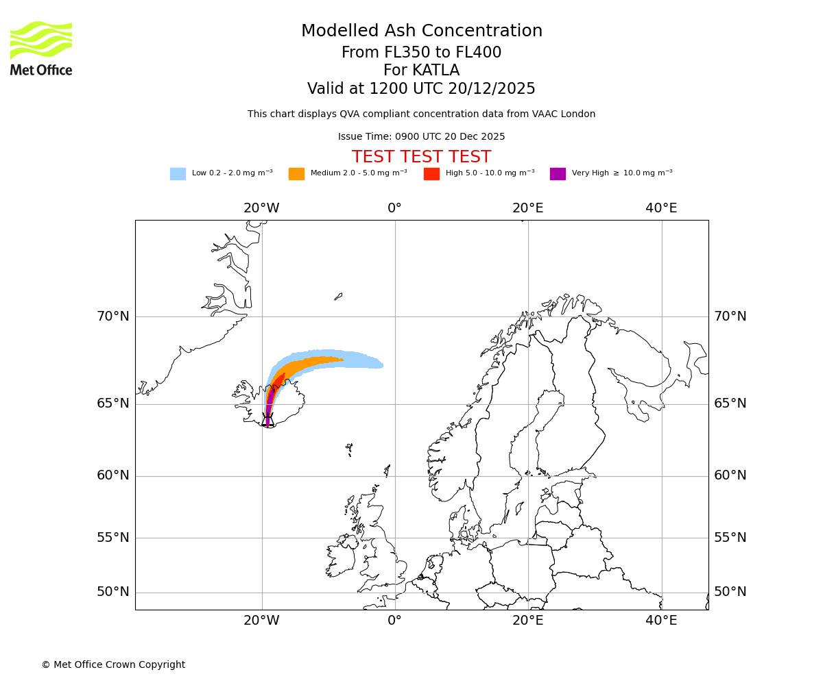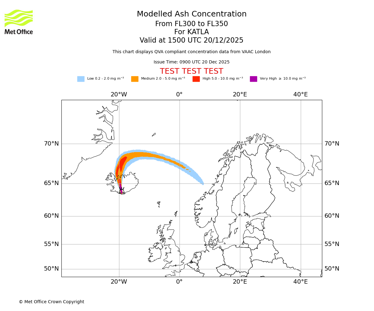 Modelled ash concentration from 300 to 350 for KATLA. Valid at 1200 UTC 20/12/2025