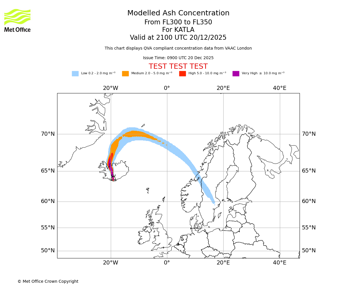Modelled ash concentration from 300 to 350 for KATLA. Valid at 1800 UTC 20/12/2025