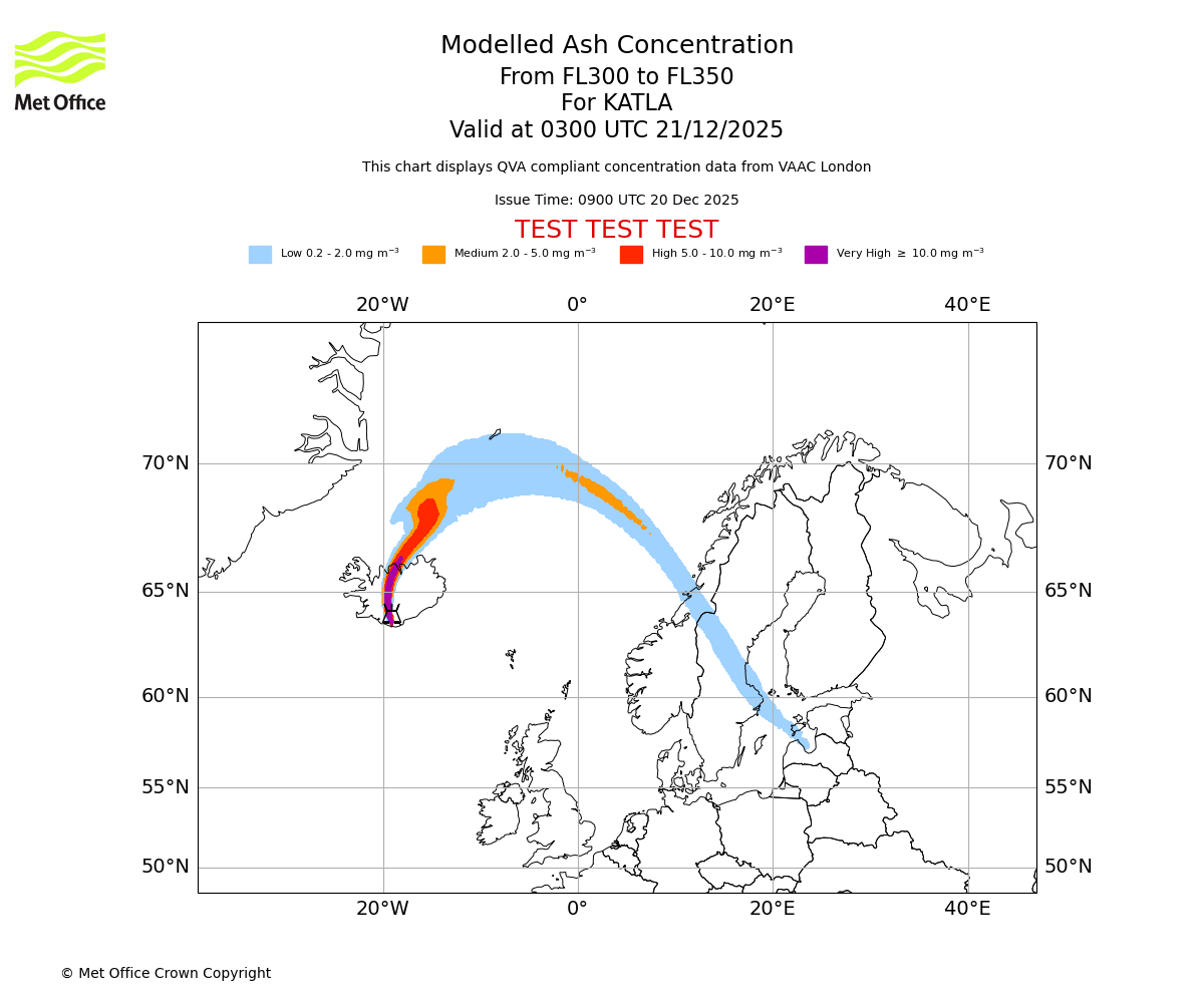 Modelled ash concentration from 300 to 350 for KATLA. Valid at 0000 UTC 21/12/2025