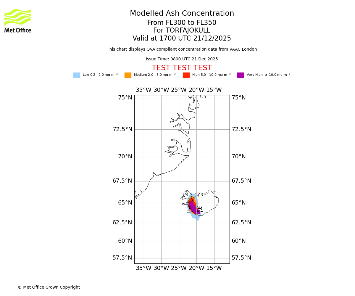 Modelled ash concentration from 300 to 350 for TORFAJOKULL. Valid at 1400 UTC 21/12/2025