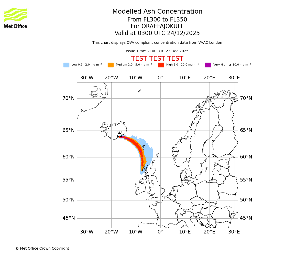 Modelled ash concentration from 300 to 350 for ORAEFAJOKULL. Valid at 0000 UTC 24/12/2025