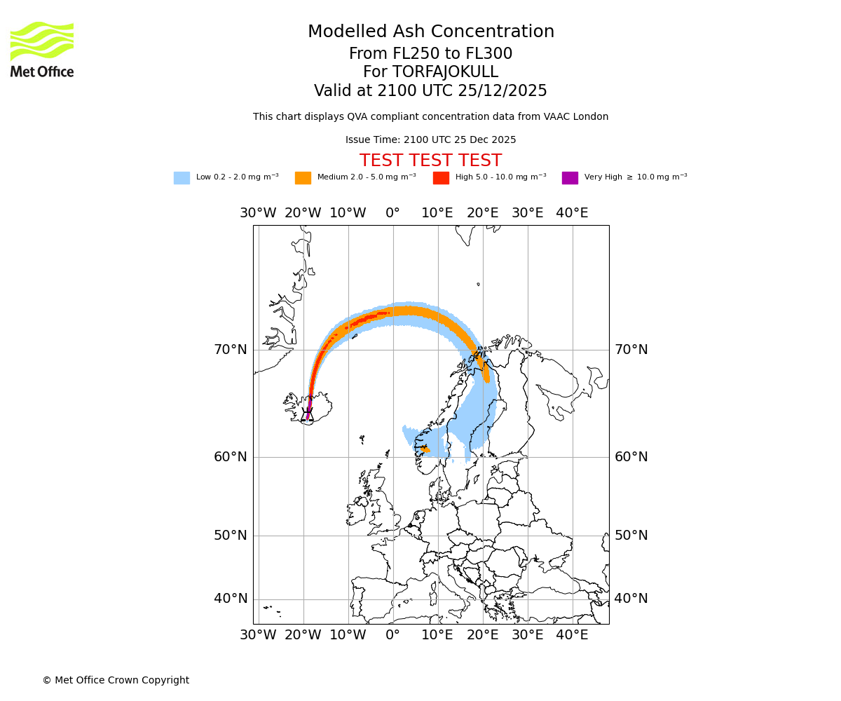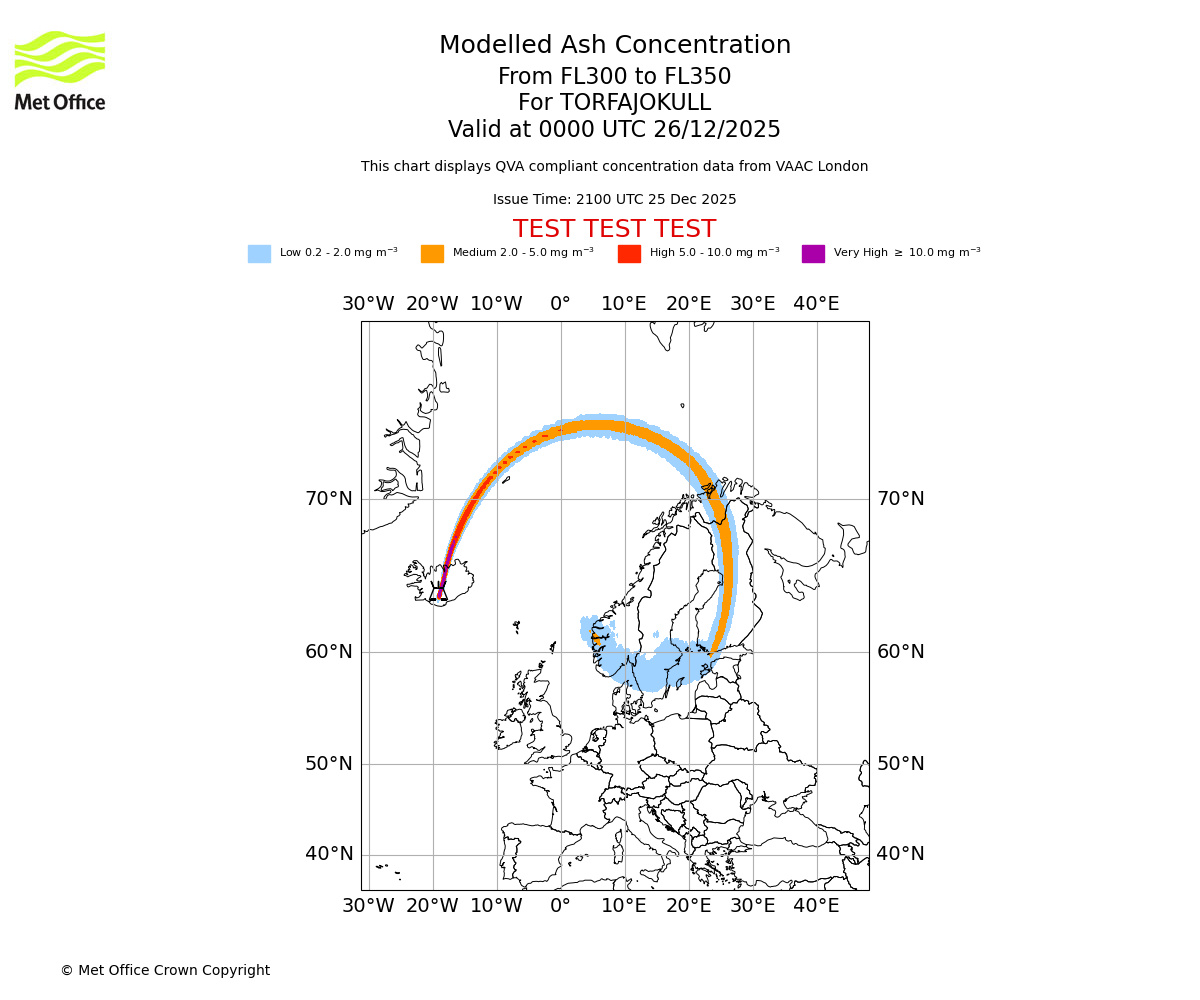 Modelled ash concentration from 300 to 350 for TORFAJOKULL. Valid at 2100 UTC 25/12/2025