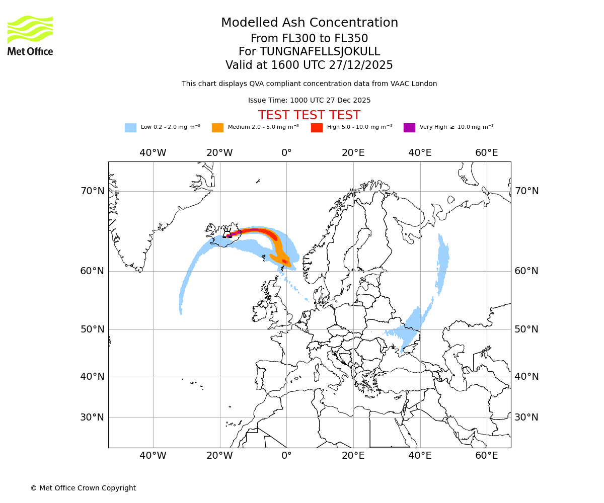 Modelled ash concentration from 300 to 350 for TUNGNAFELLSJOKULL. Valid at 1300 UTC 27/12/2025