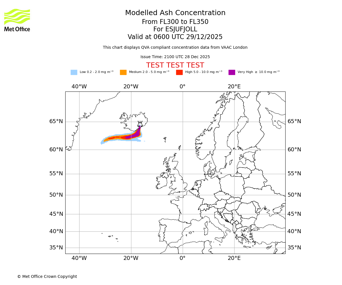 Modelled ash concentration from 300 to 350 for ESJUFJOLL. Valid at 0300 UTC 29/12/2025