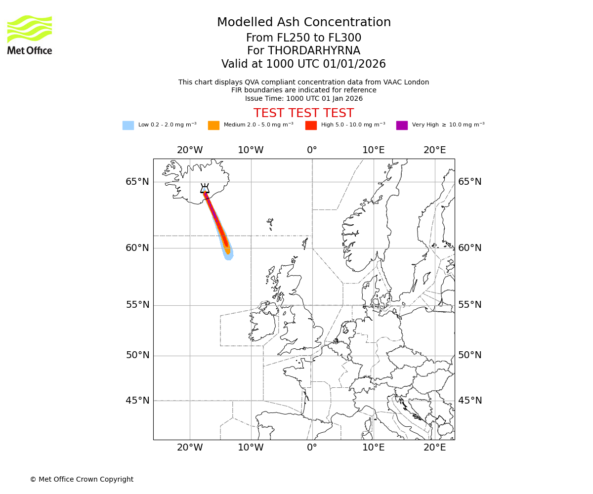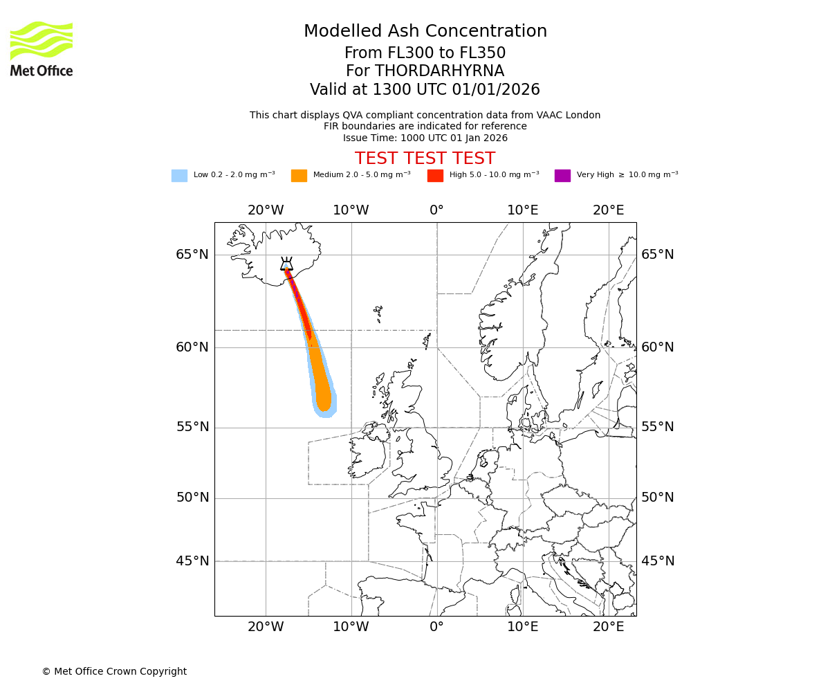 Modelled ash concentration from 300 to 350 for THORDARHYRNA. Valid at 1000 UTC 01/01/2026