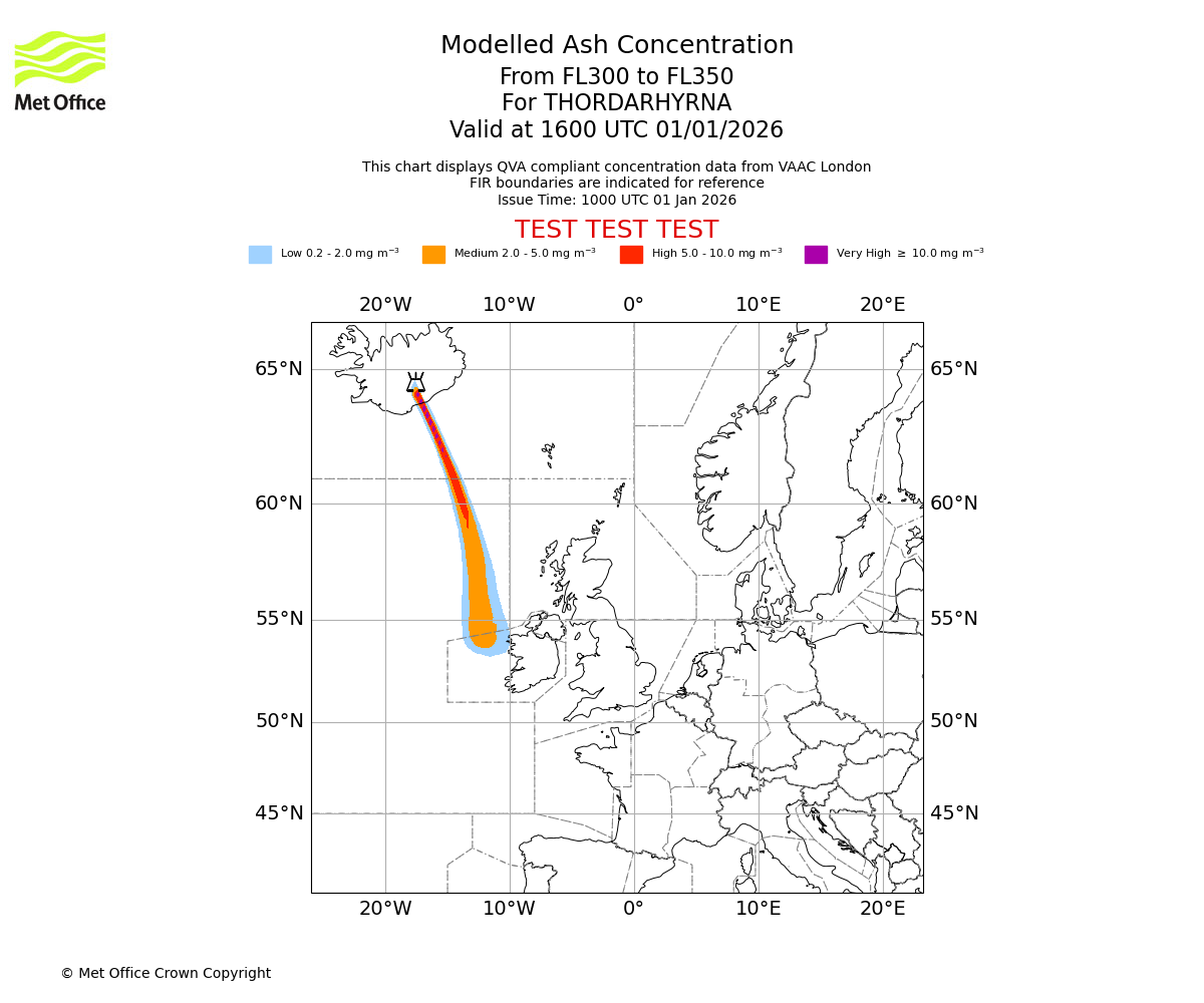 Modelled ash concentration from 300 to 350 for THORDARHYRNA. Valid at 1300 UTC 01/01/2026