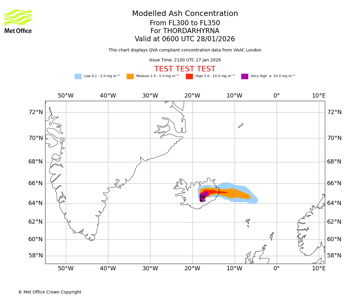 Modelled ash concentration from 300 to 350 for THORDARHYRNA. Valid at 0300 UTC 28/01/2026