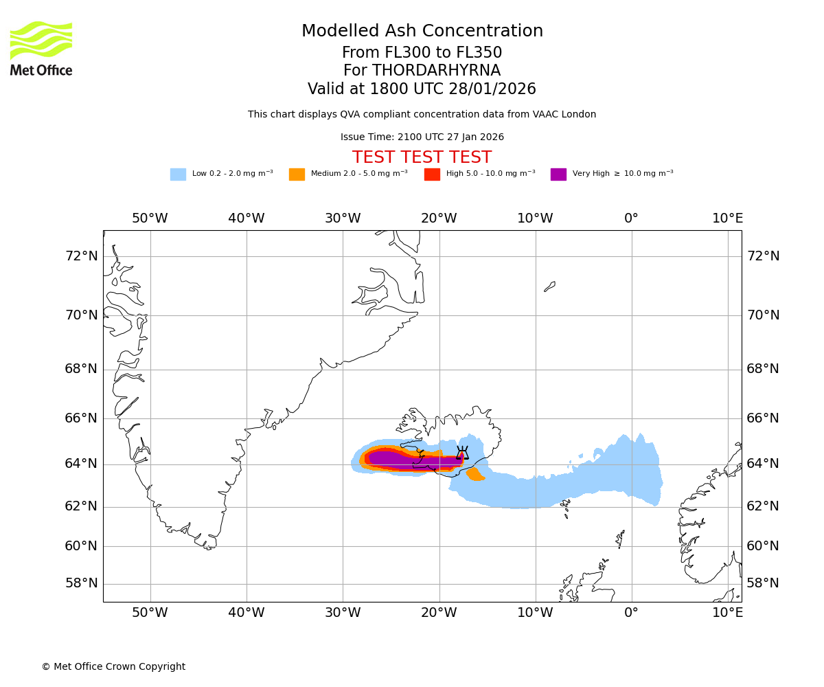 Modelled ash concentration from 300 to 350 for THORDARHYRNA. Valid at 1500 UTC 28/01/2026