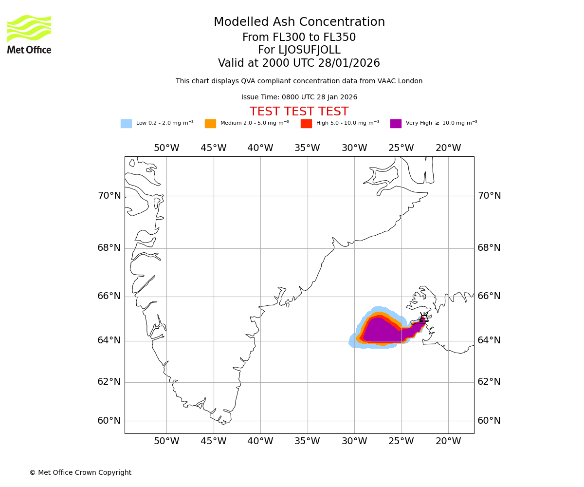 Modelled ash concentration from 000 to 200 for LJOSUFJOLL. Valid at 0800 UTC 28/01/2026