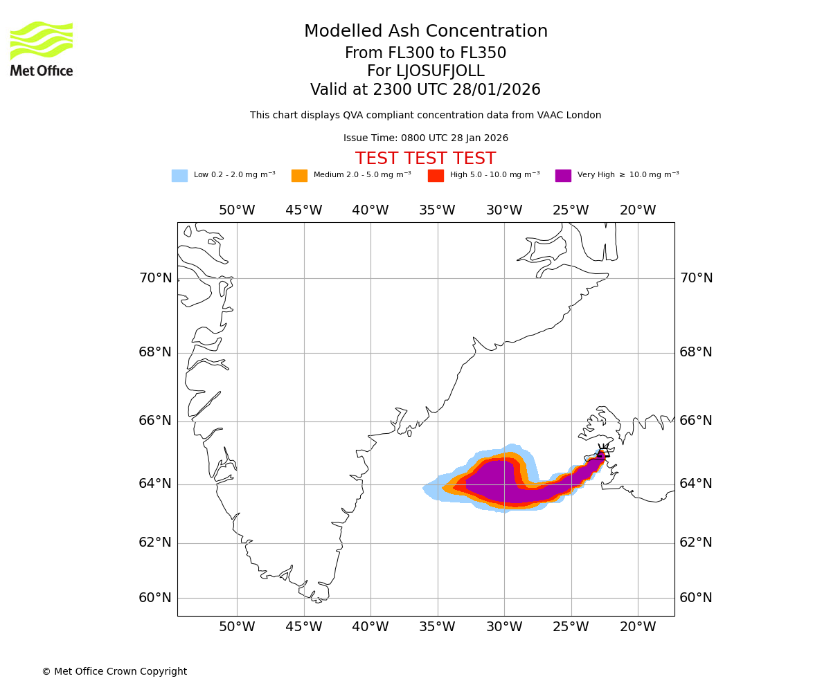 Modelled ash concentration from 300 to 350 for LJOSUFJOLL. Valid at 2000 UTC 28/01/2026