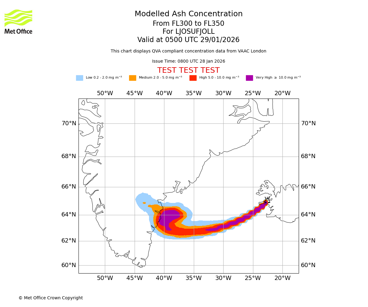 Modelled ash concentration from 300 to 350 for LJOSUFJOLL. Valid at 0200 UTC 29/01/2026