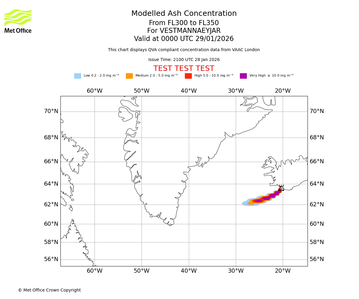 Modelled ash concentration from 300 to 350 for VESTMANNAEYJAR. Valid at 2100 UTC 28/01/2026