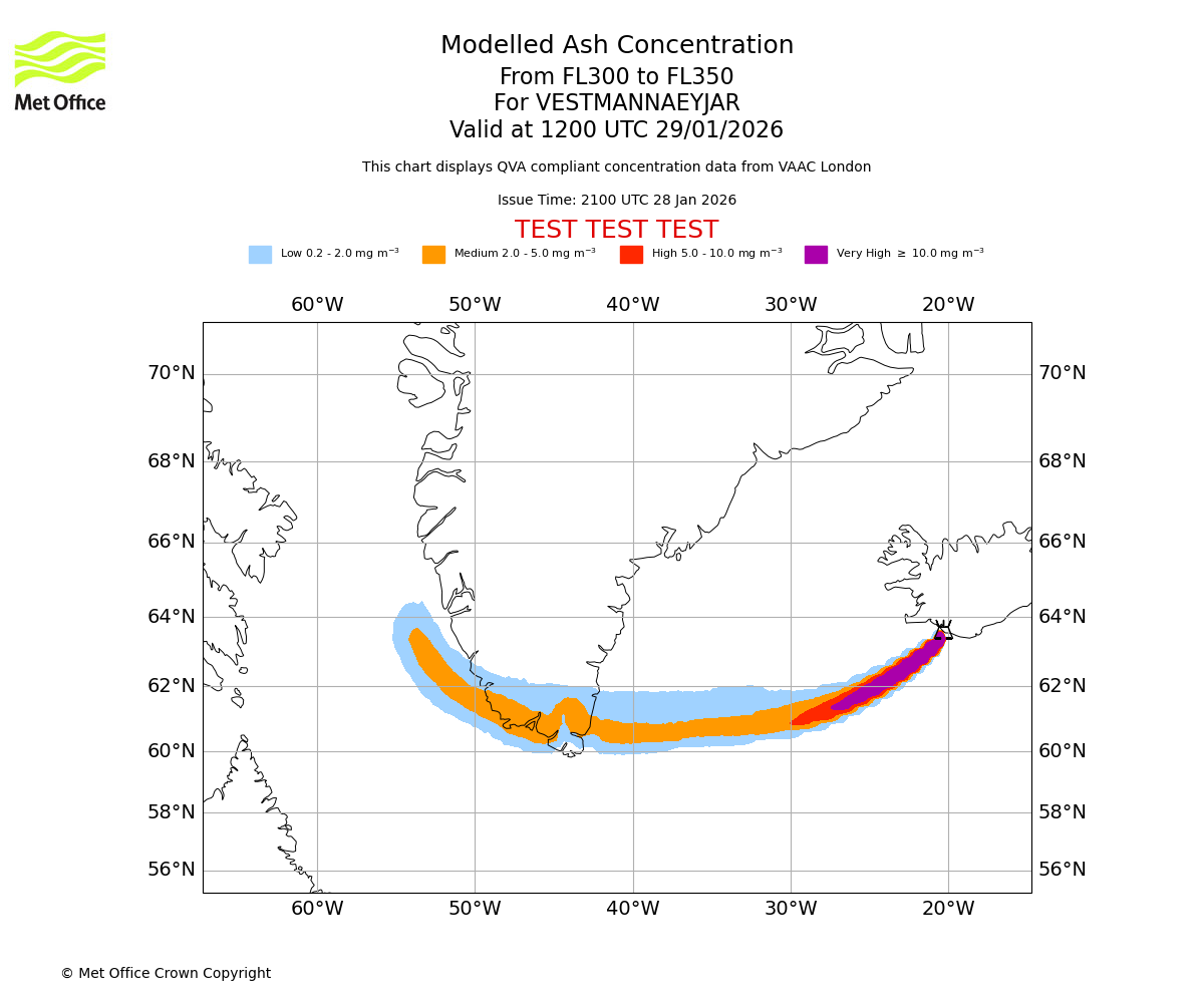 Modelled ash concentration from 300 to 350 for VESTMANNAEYJAR. Valid at 0900 UTC 29/01/2026