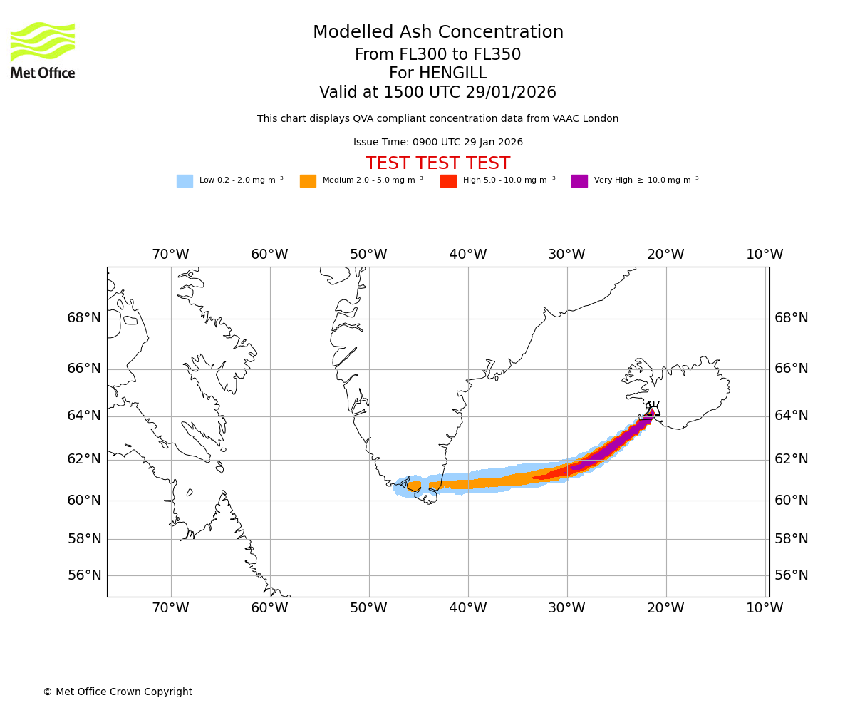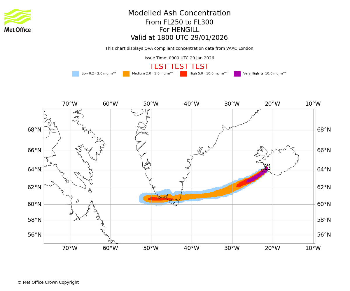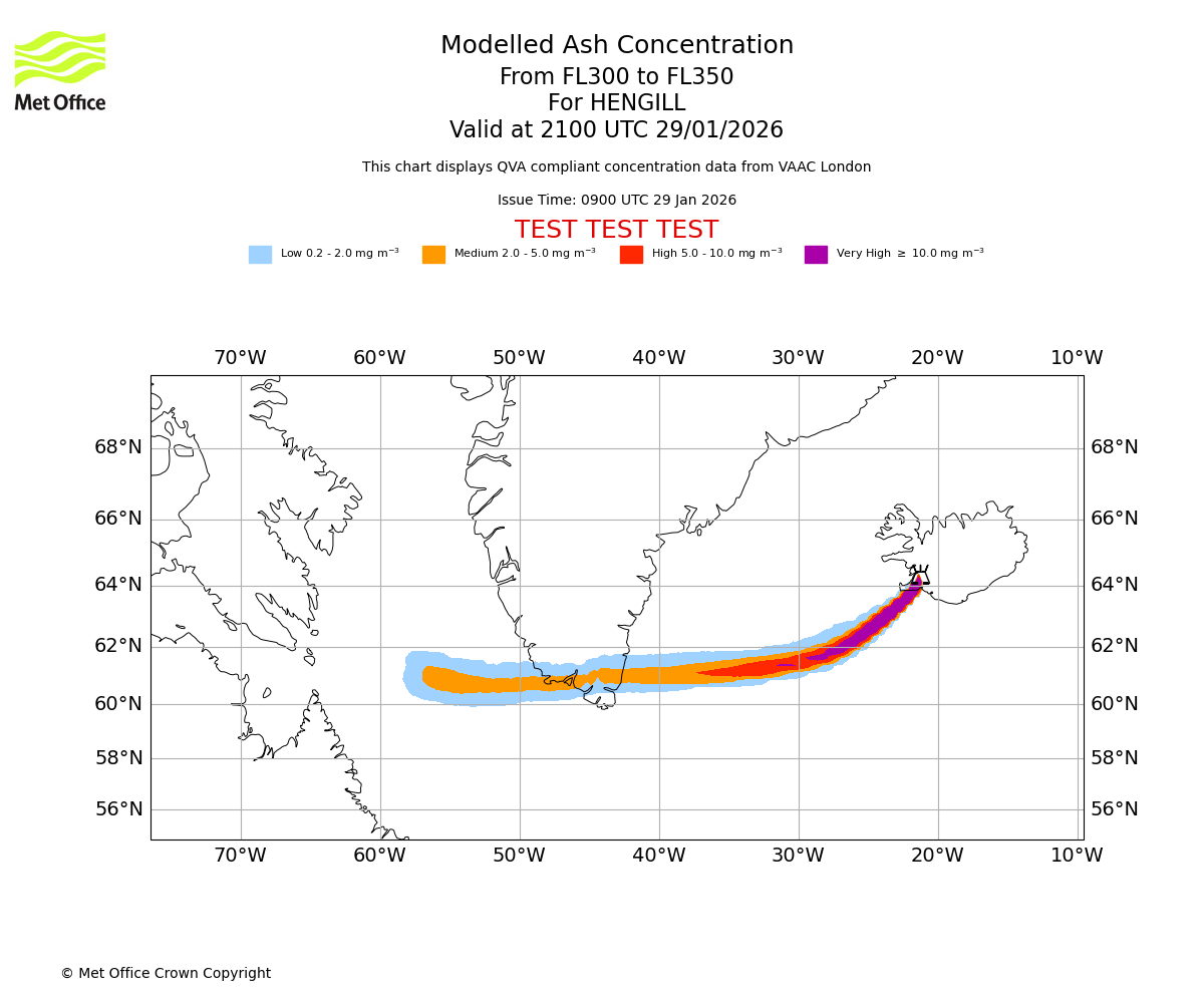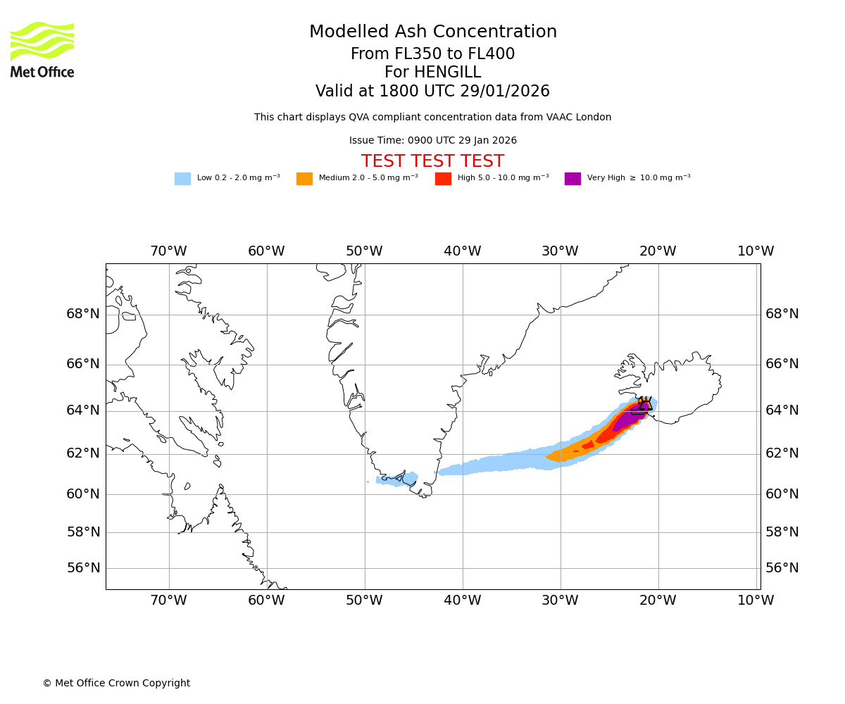 Modelled ash concentration from 300 to 350 for HENGILL. Valid at 1800 UTC 29/01/2026