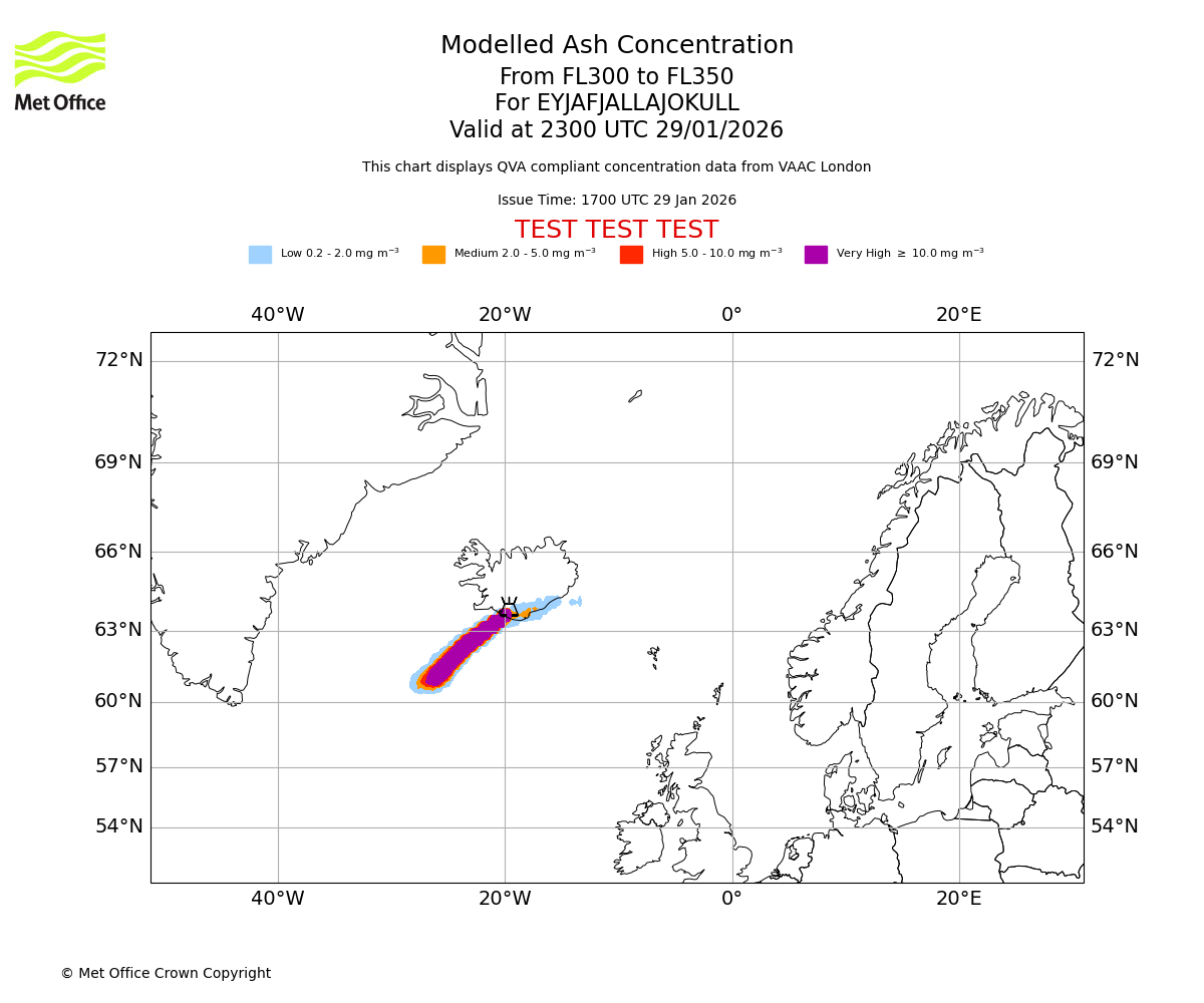 Modelled ash concentration from 300 to 350 for EYJAFJALLAJOKULL. Valid at 2000 UTC 29/01/2026