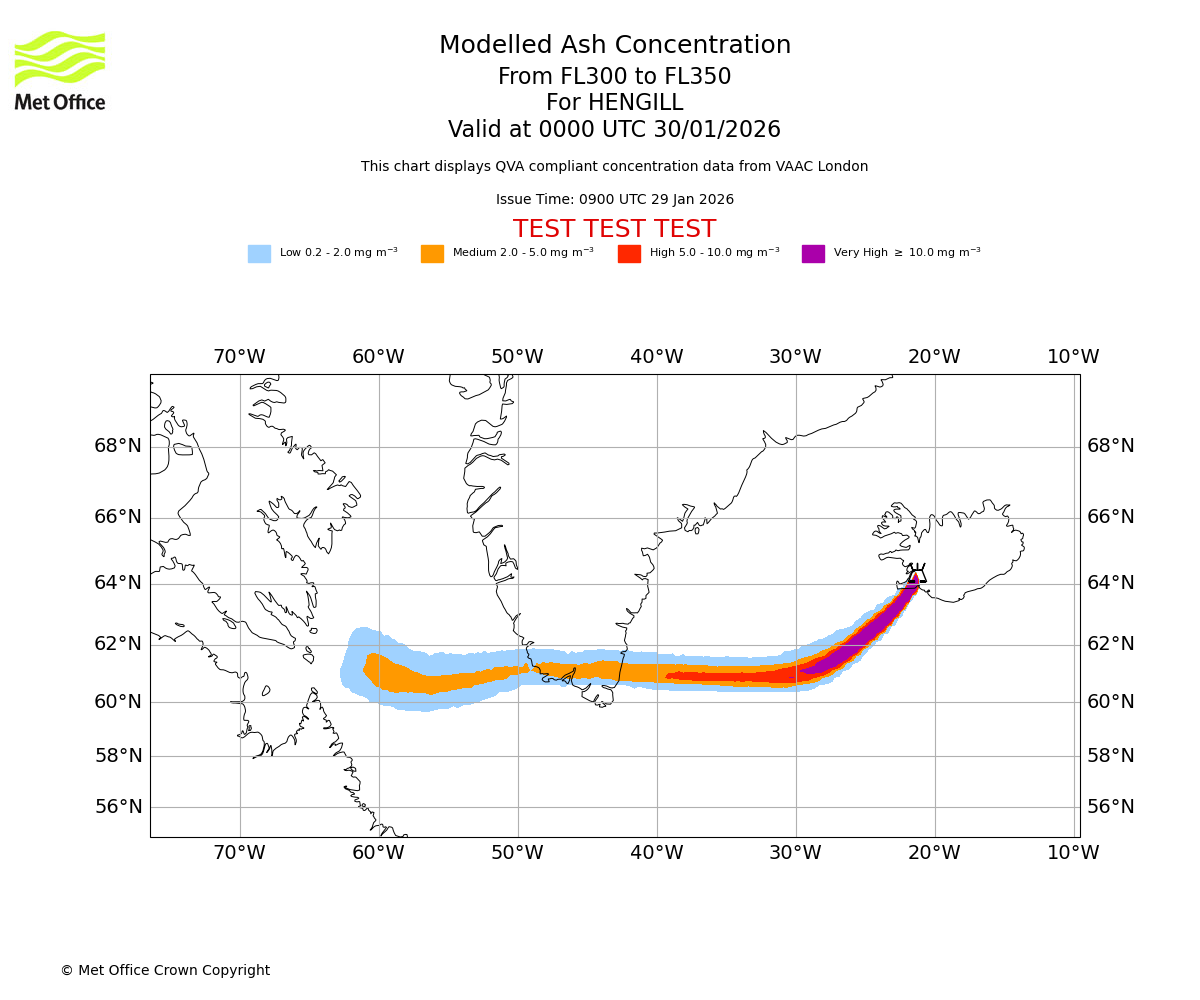 Modelled ash concentration from 300 to 350 for HENGILL. Valid at 2100 UTC 29/01/2026