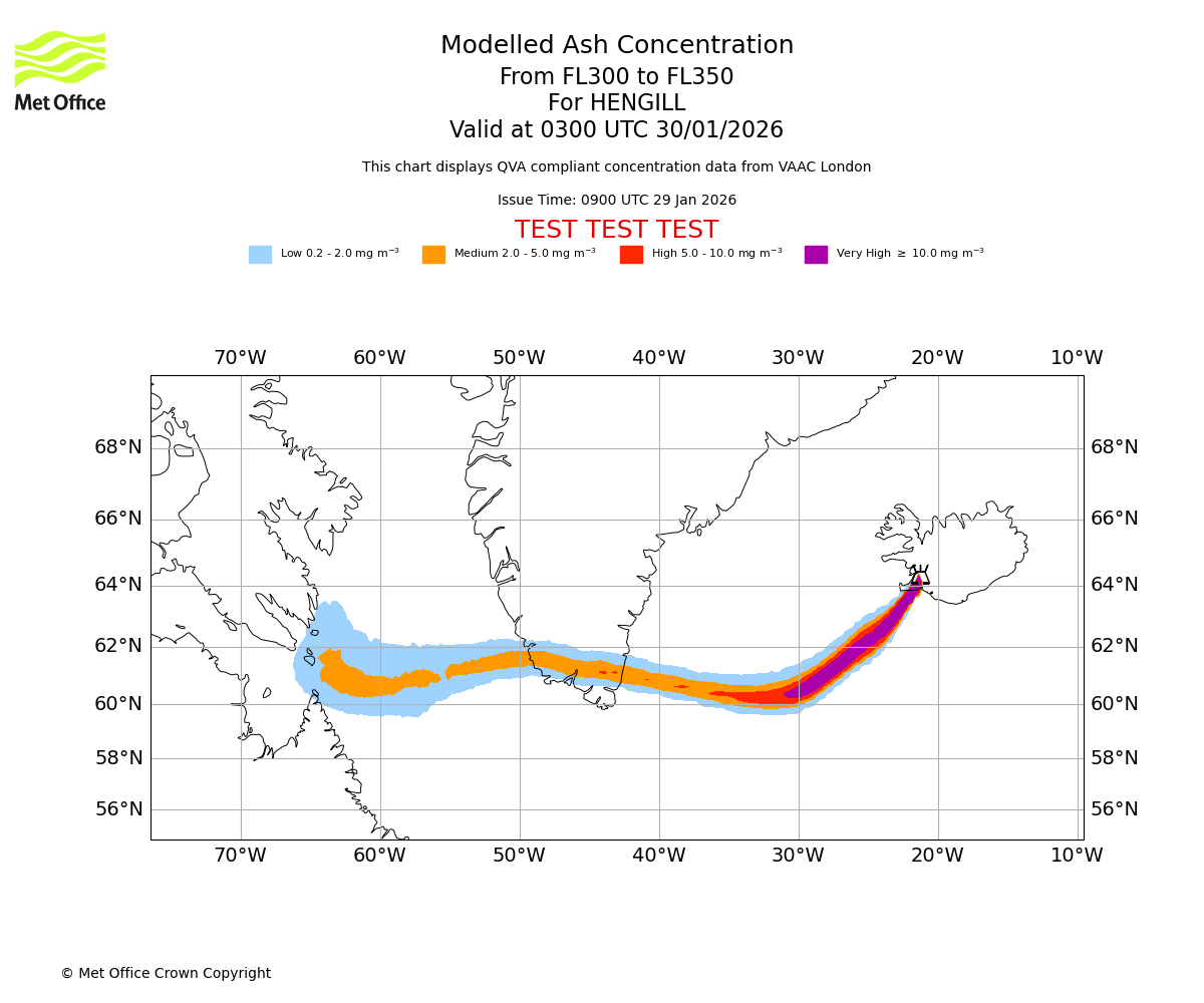 Modelled ash concentration from 300 to 350 for HENGILL. Valid at 0000 UTC 30/01/2026