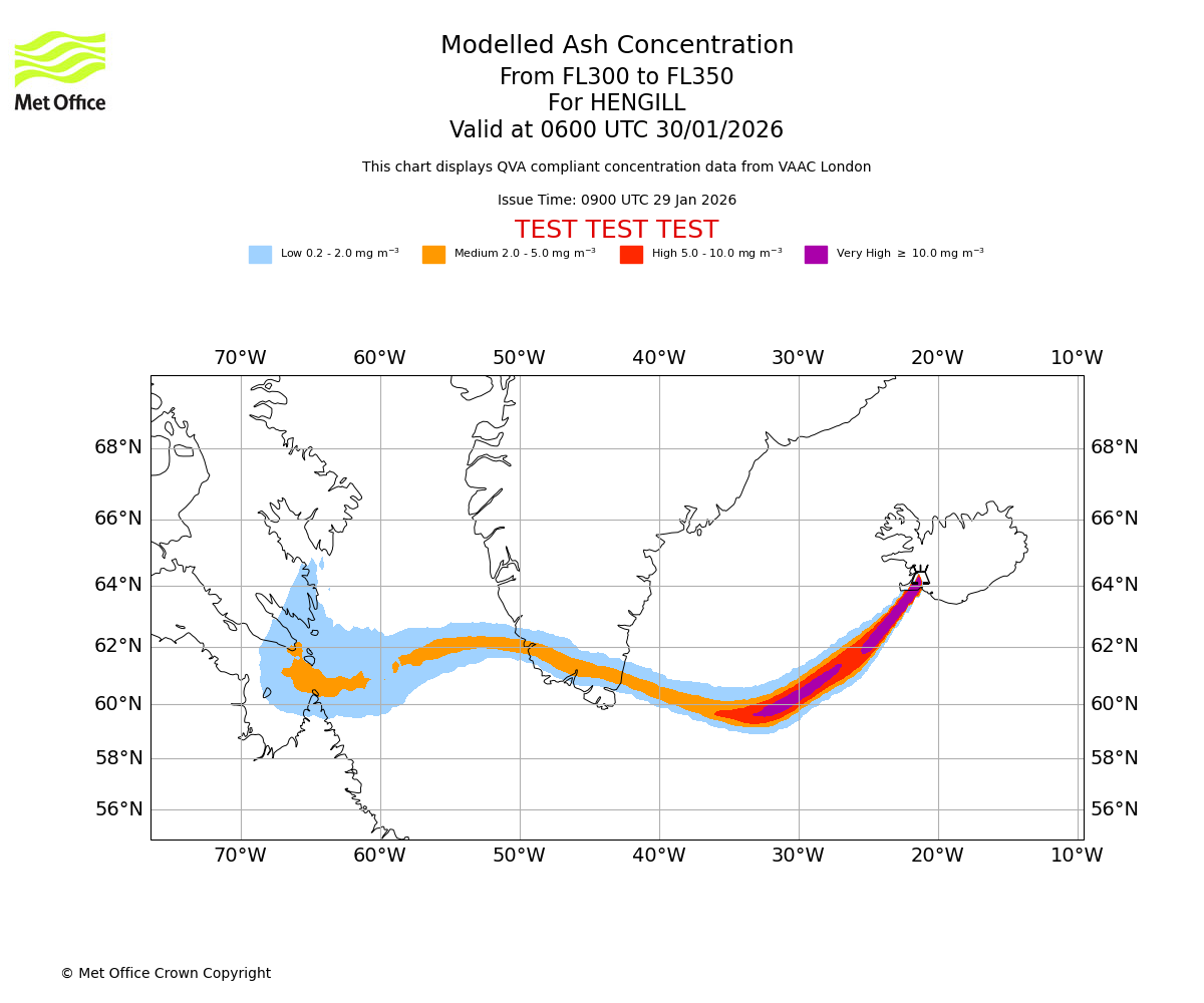 Modelled ash concentration from 300 to 350 for HENGILL. Valid at 0300 UTC 30/01/2026