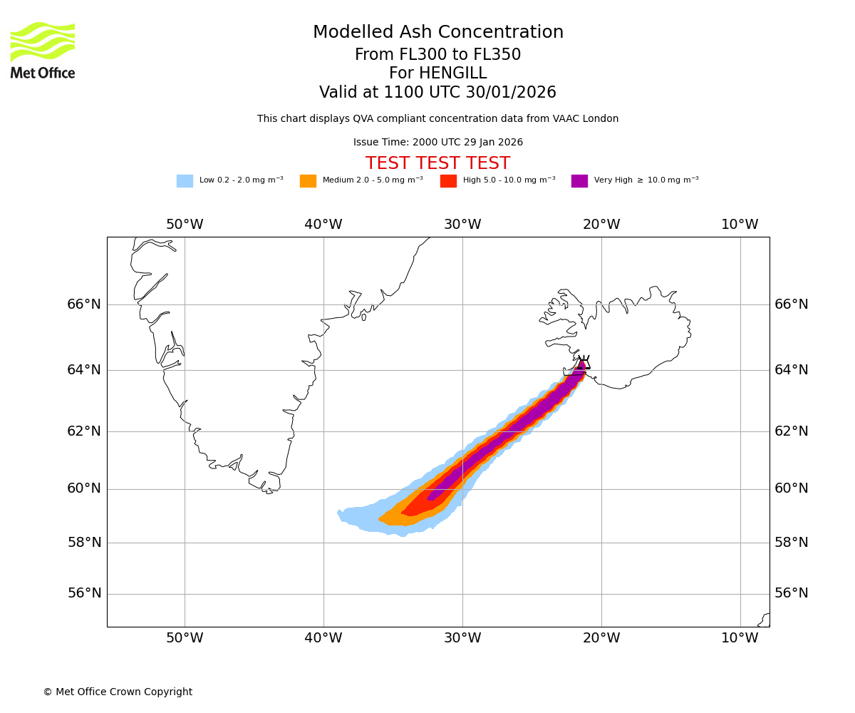 Modelled ash concentration from 300 to 350 for HENGILL. Valid at 0800 UTC 30/01/2026