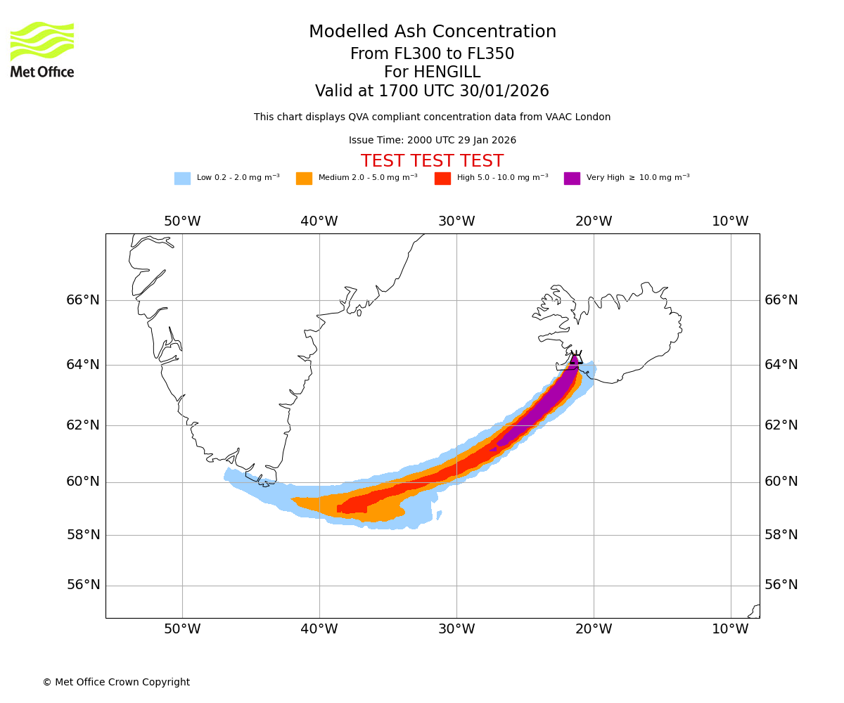 Modelled ash concentration from 300 to 350 for HENGILL. Valid at 1400 UTC 30/01/2026