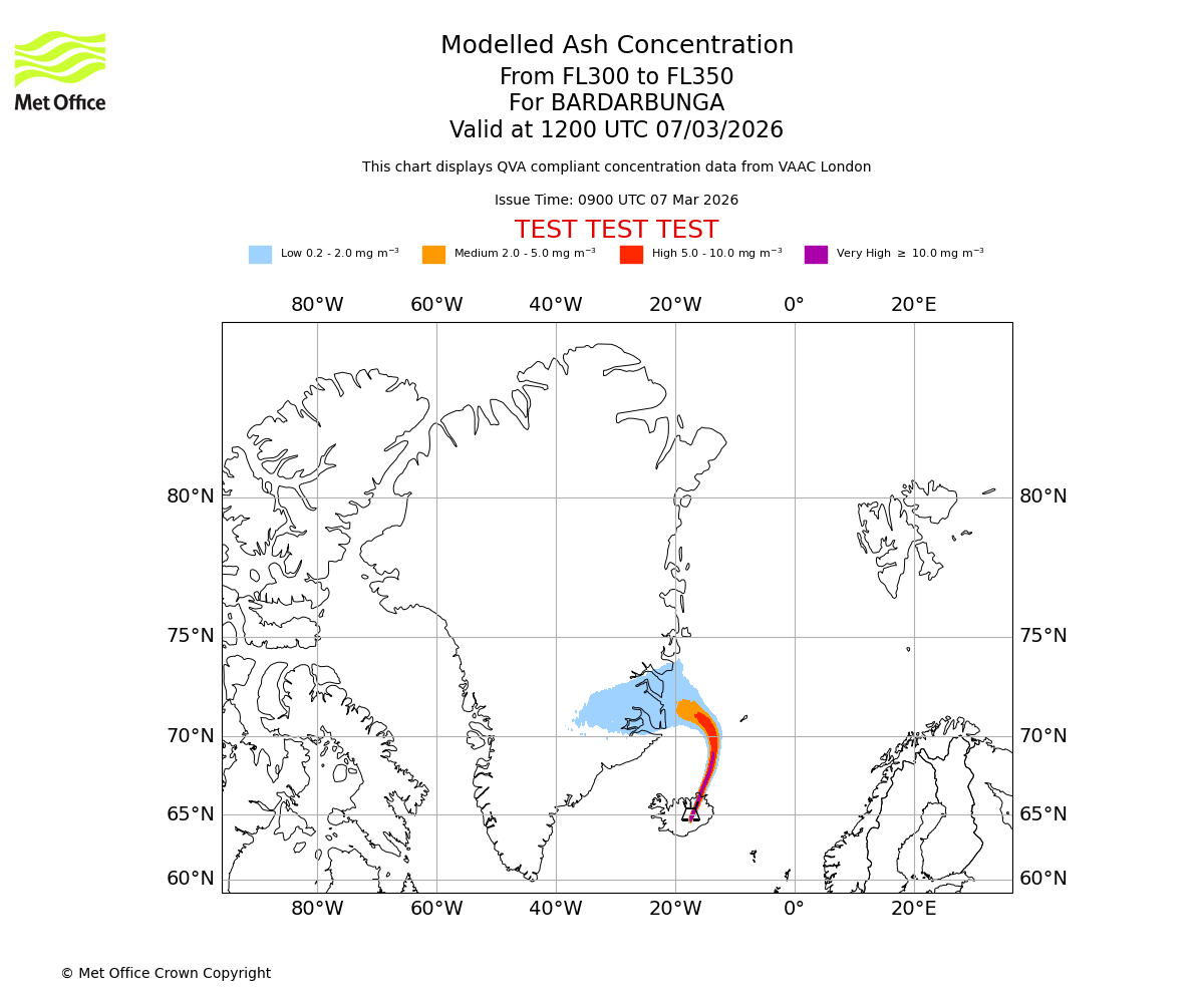 Modelled ash concentration from 300 to 350 for BARDARBUNGA. Valid at 0900 UTC 07/03/2026