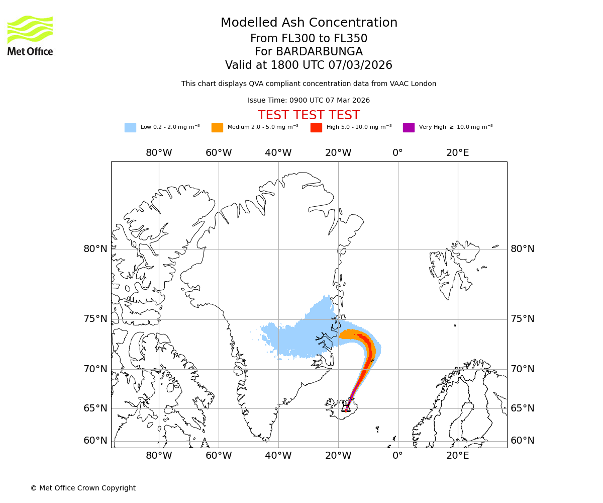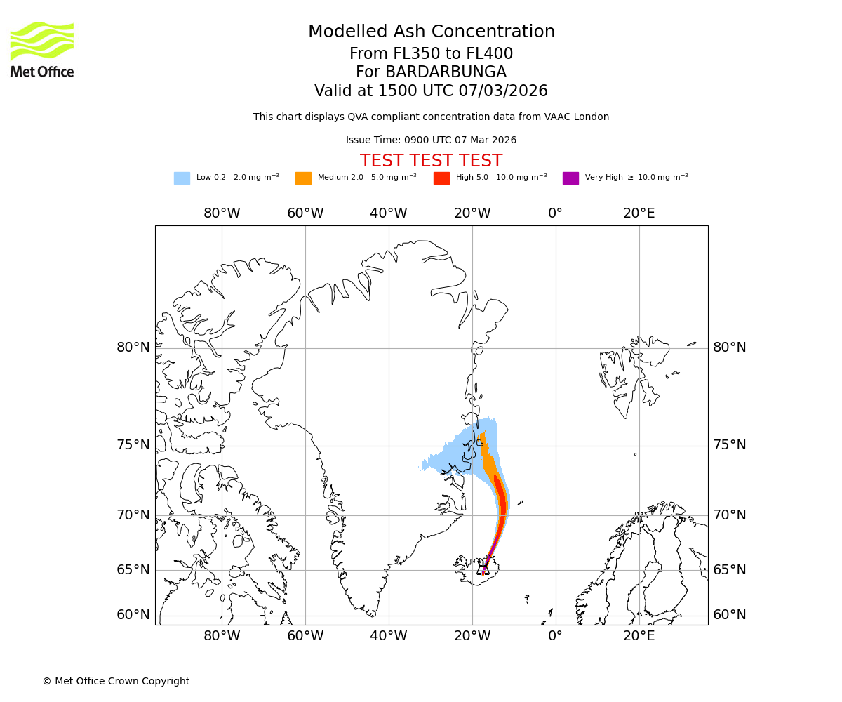 Modelled ash concentration from 300 to 350 for BARDARBUNGA. Valid at 1500 UTC 07/03/2026