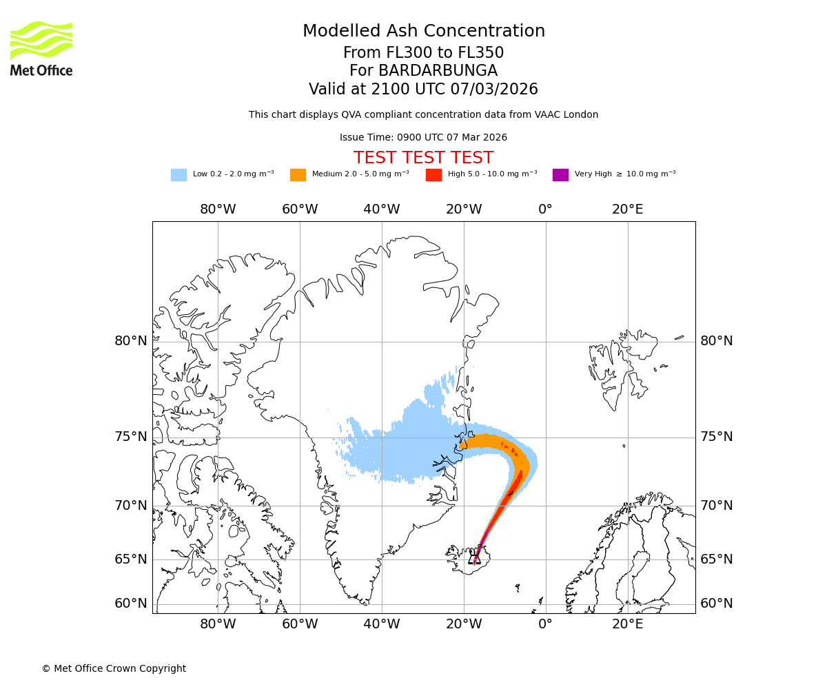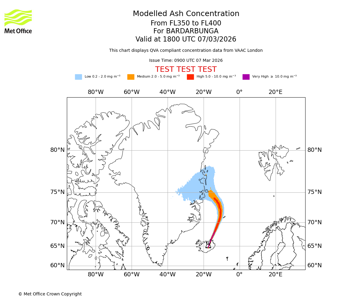 Modelled ash concentration from 300 to 350 for BARDARBUNGA. Valid at 1800 UTC 07/03/2026