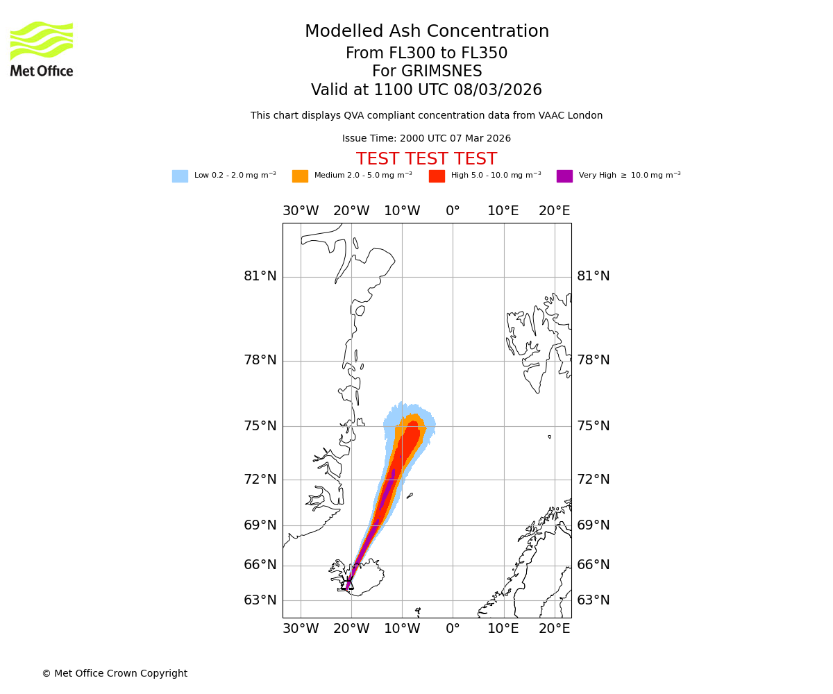 Modelled ash concentration from 300 to 350 for GRIMSNES. Valid at 0800 UTC 08/03/2026