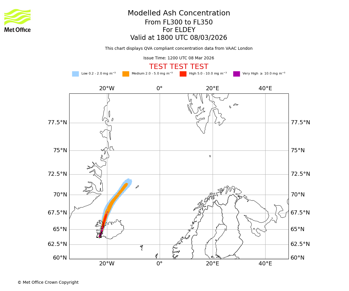 Modelled ash concentration from 300 to 350 for ELDEY. Valid at 1500 UTC 08/03/2026