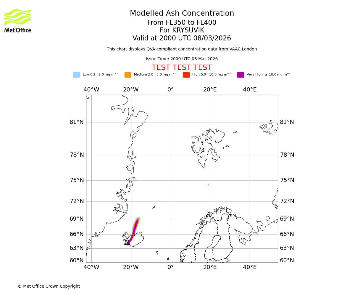 Modelled ash concentration from 300 to 350 for KRYSUVIK. Valid at 2000 UTC 08/03/2026