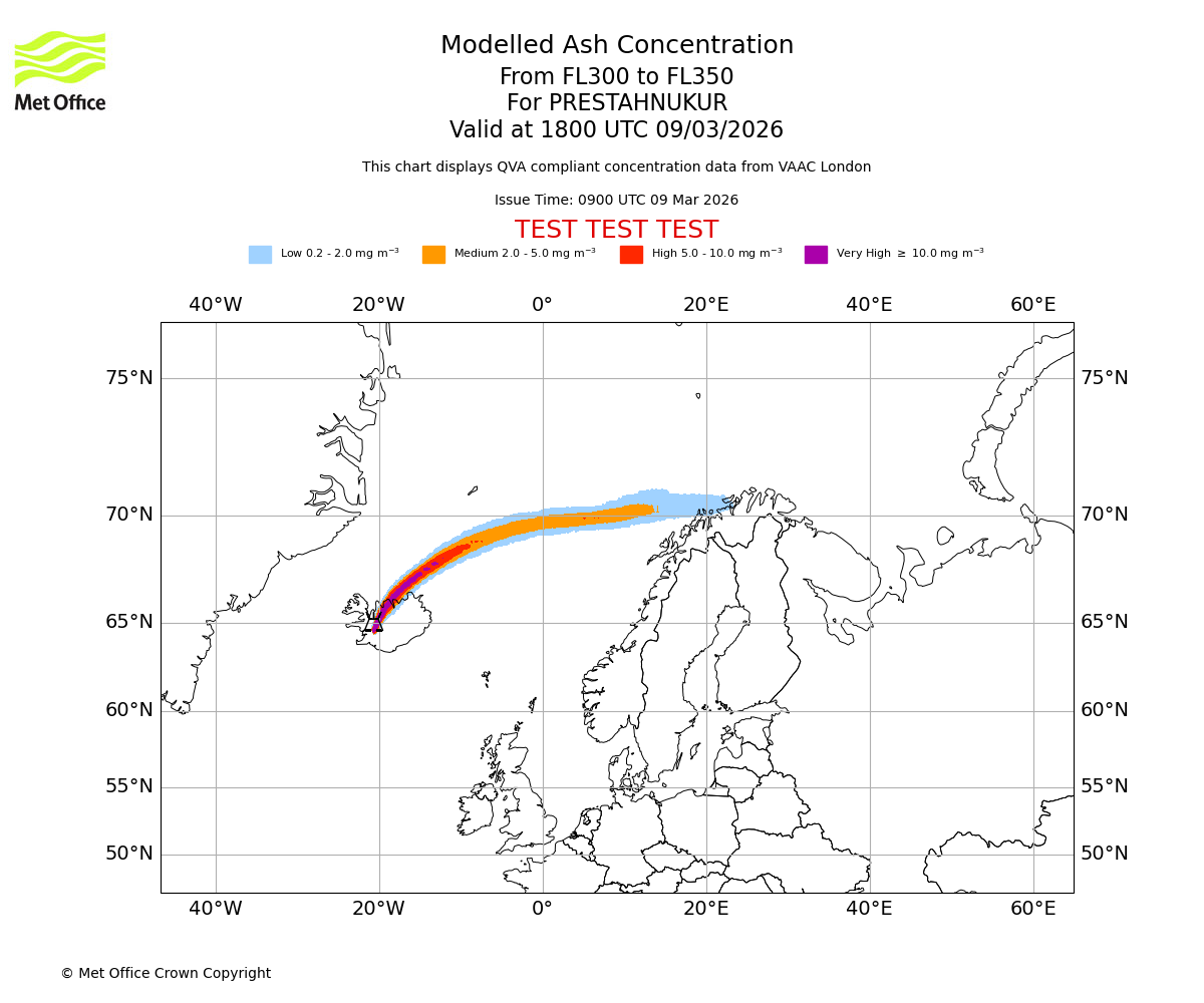 Modelled ash concentration from 300 to 350 for PRESTAHNUKUR. Valid at 1500 UTC 09/03/2026