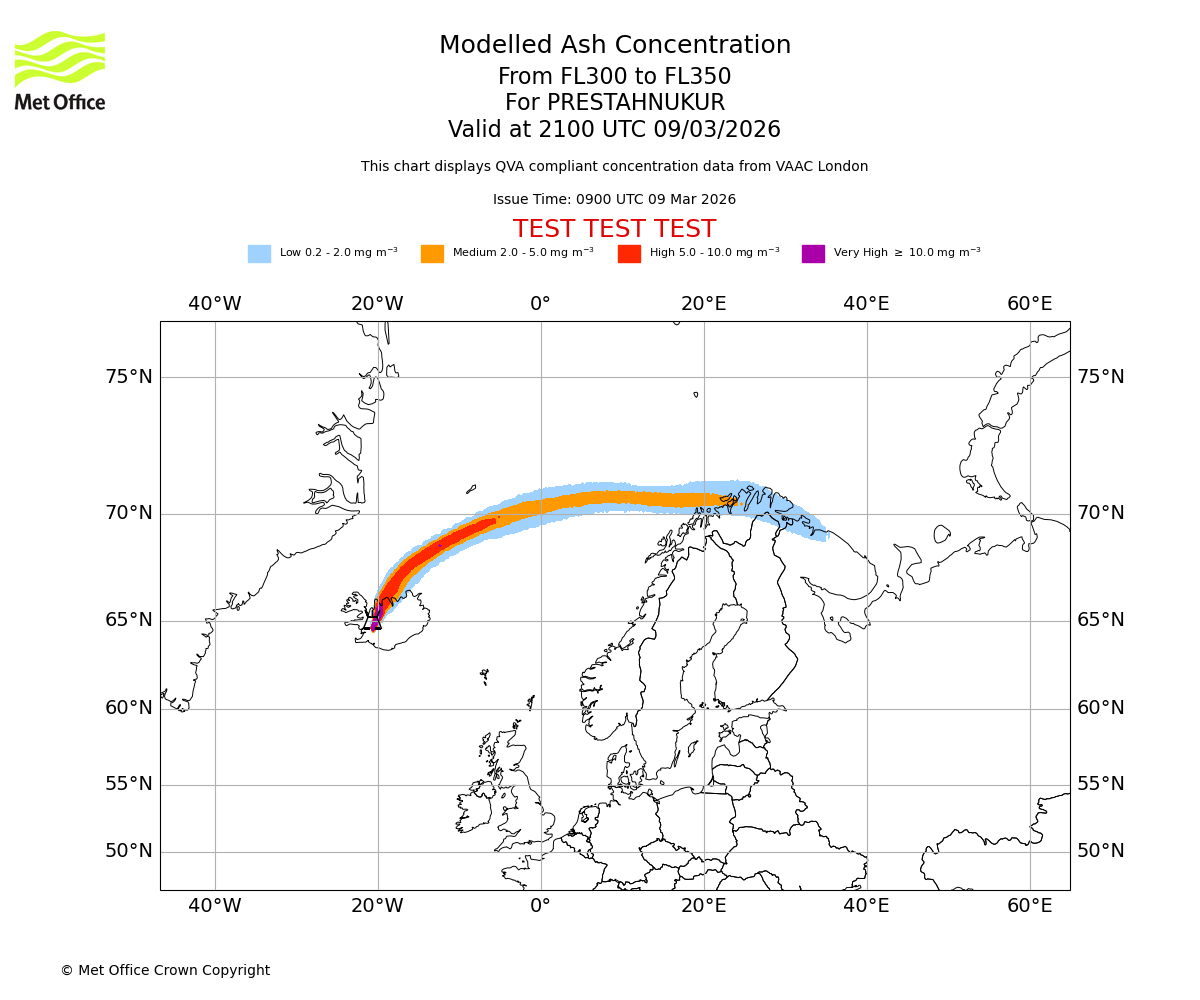 Modelled ash concentration from 300 to 350 for PRESTAHNUKUR. Valid at 1800 UTC 09/03/2026