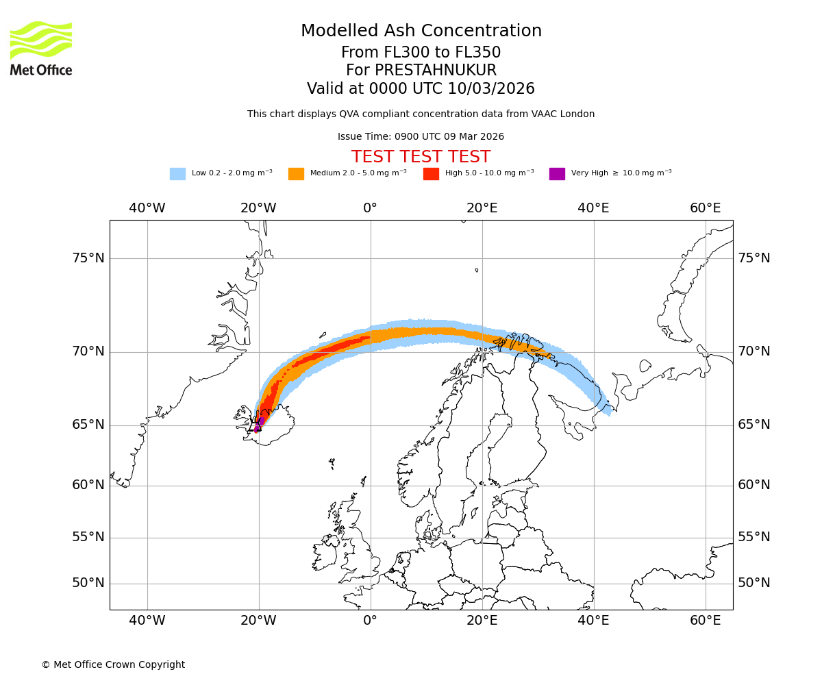 Modelled ash concentration from 300 to 350 for PRESTAHNUKUR. Valid at 2100 UTC 09/03/2026