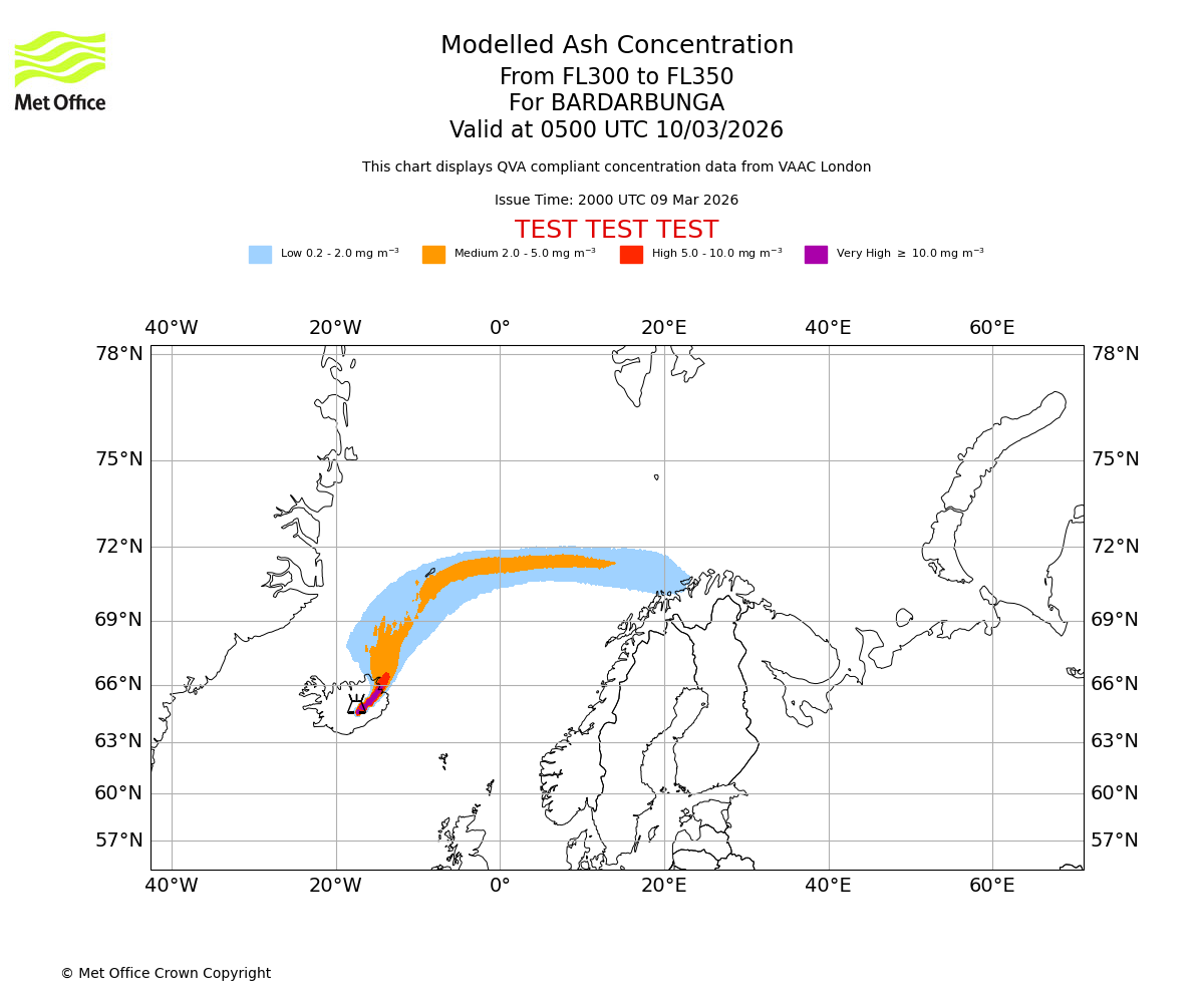 Modelled ash concentration from 300 to 350 for BARDARBUNGA. Valid at 0200 UTC 10/03/2026