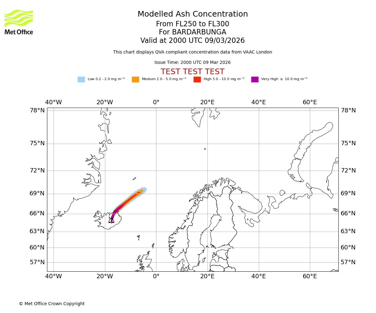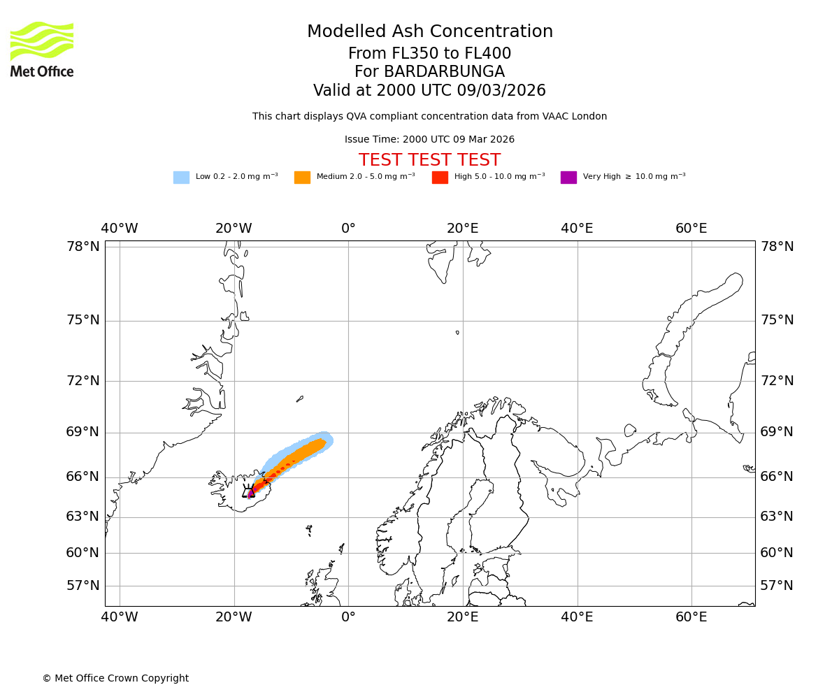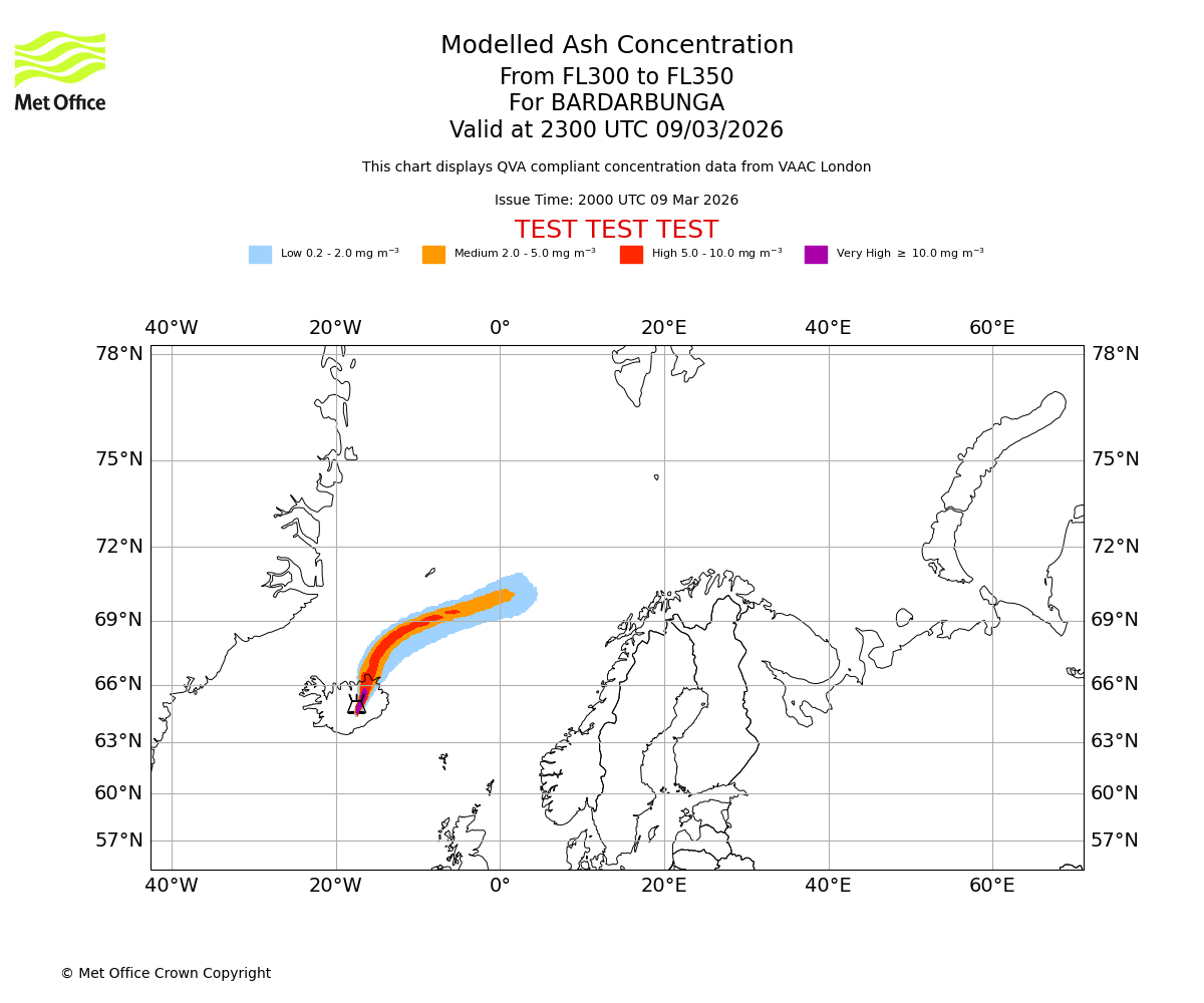Modelled ash concentration from 300 to 350 for BARDARBUNGA. Valid at 2000 UTC 09/03/2026