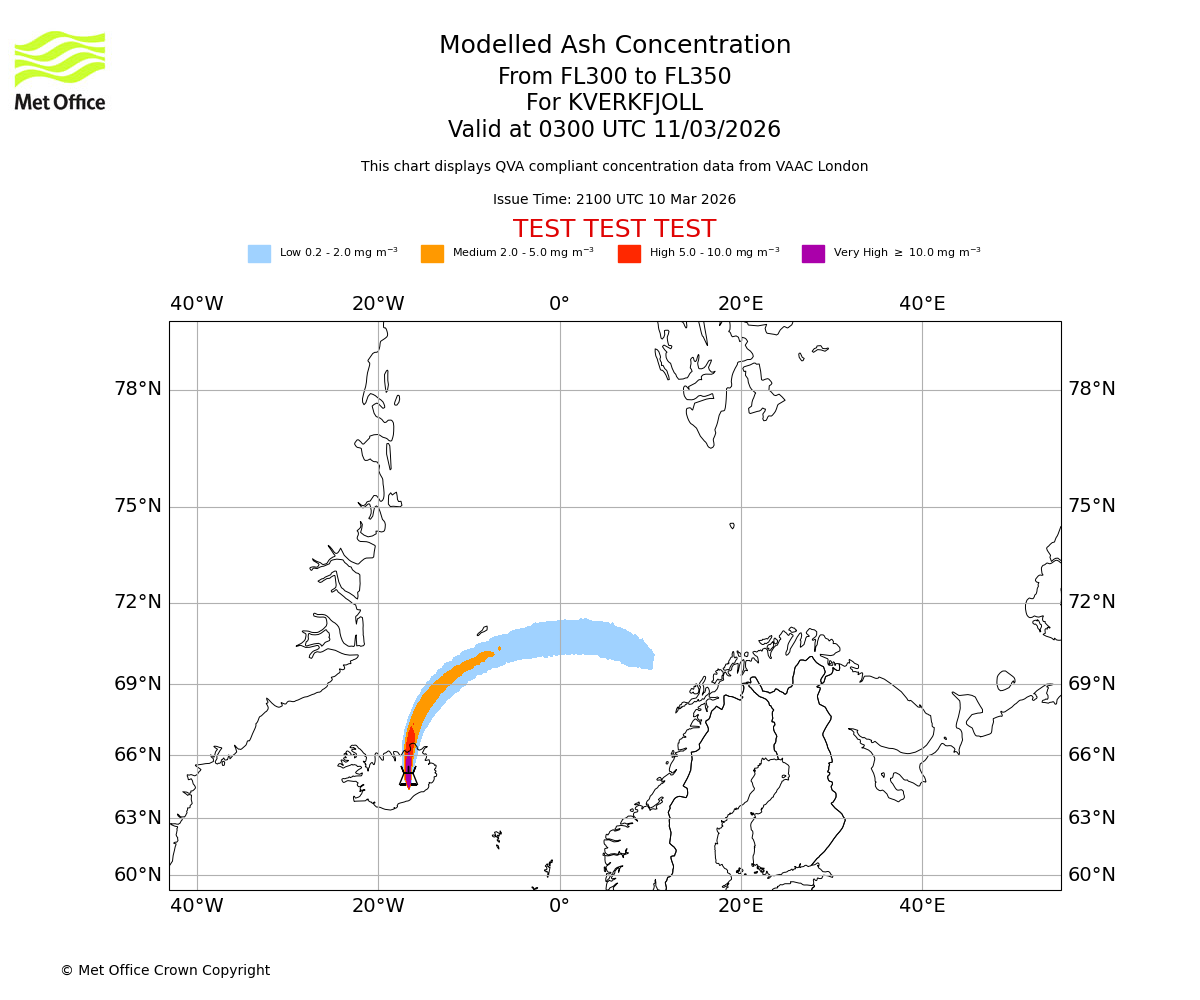 Modelled ash concentration from 300 to 350 for KVERKFJOLL. Valid at 0000 UTC 11/03/2026