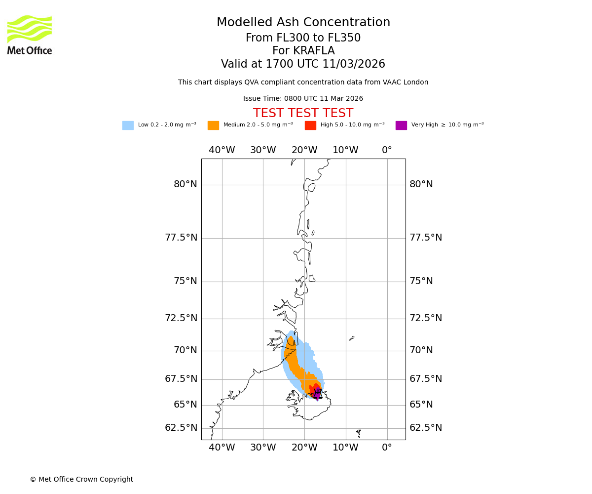 Modelled ash concentration from 300 to 350 for KRAFLA. Valid at 1400 UTC 11/03/2026